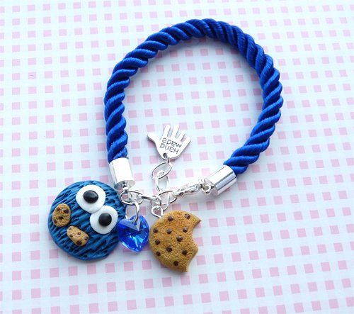 Oryginalna i urocza bransoletka sznurkowa z Ciasteczkowym Potworem:) długość bransoletki: ok.15cm + 4cm łańcuszka przedłużającego (mogę na życzenie skrócić/wydłużyć) średnica Ciasteczkowego Potwora: ok.2cm, średnica ciastka: ok.1.5cm, średnica kryształu: 1cm. Wysyłam ozdobnie zapakowaną;)