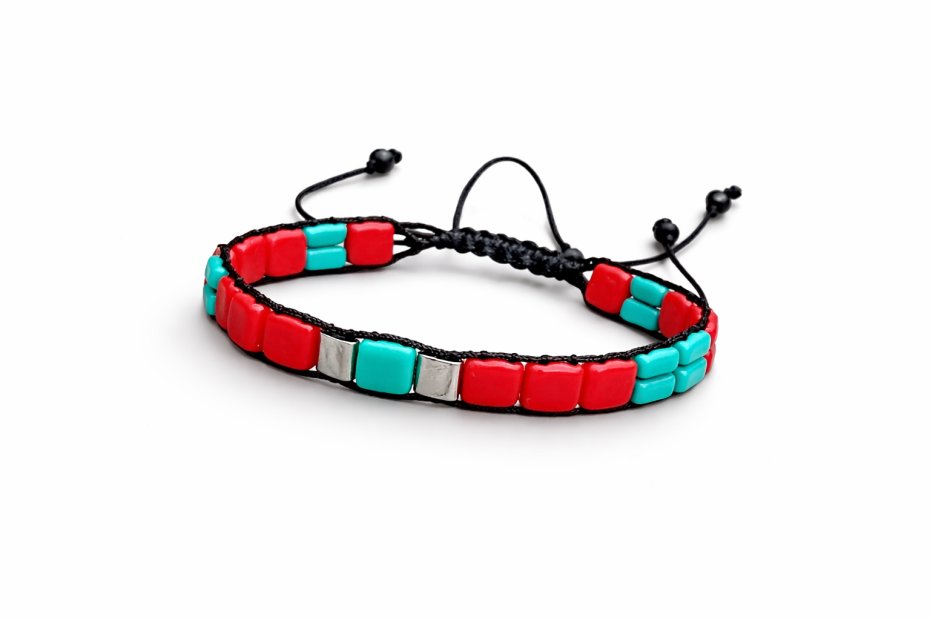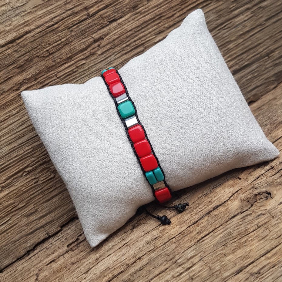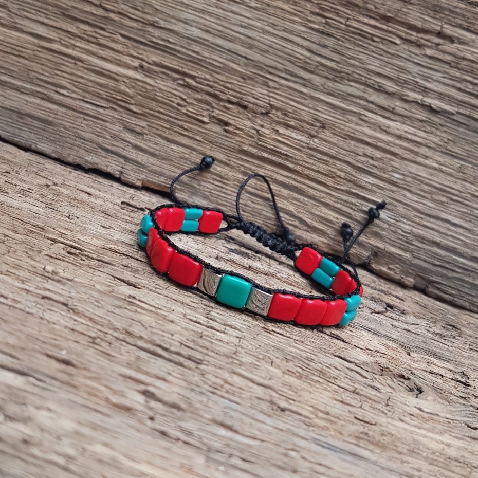 Bransoletka z kostek czerwonych i turkusowych. Zapięcie regulowane, wyplecione ściegiem makramowym pozwala przeciągnąć bransoletkę przez dłoń obj. 25 cm, najmniejszy obwód nadgarstka 15 cm