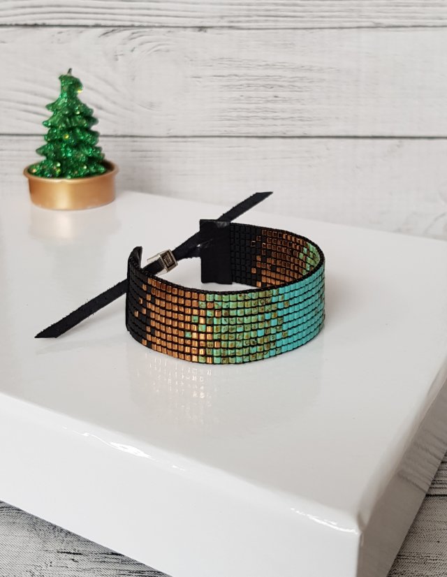 Bransoletka wykonana pracochłonną techniką tkania na krośnie, z oryginalnych japońskich, szklanych koralików, nazywanych skarbem wschodu i wybieranych przez projektantów biżuterii i odzieży na całym świecie.