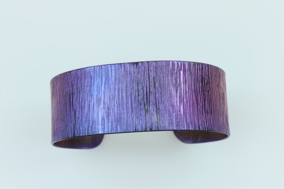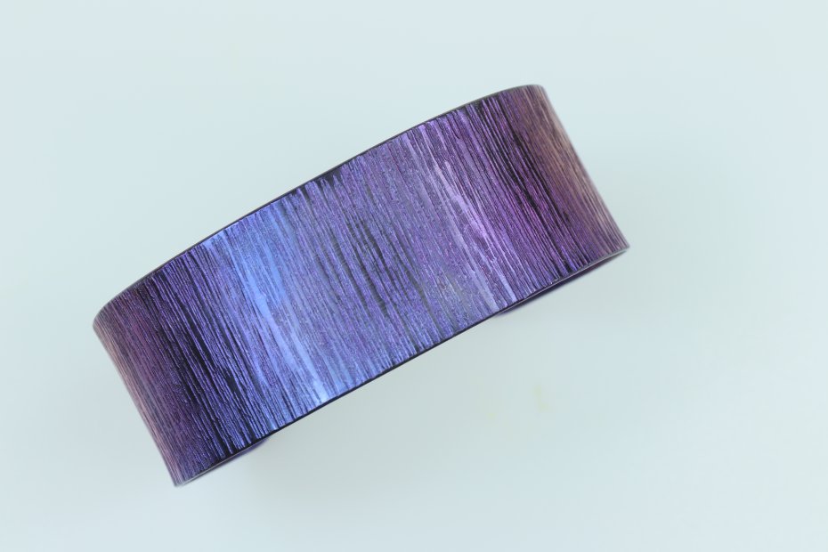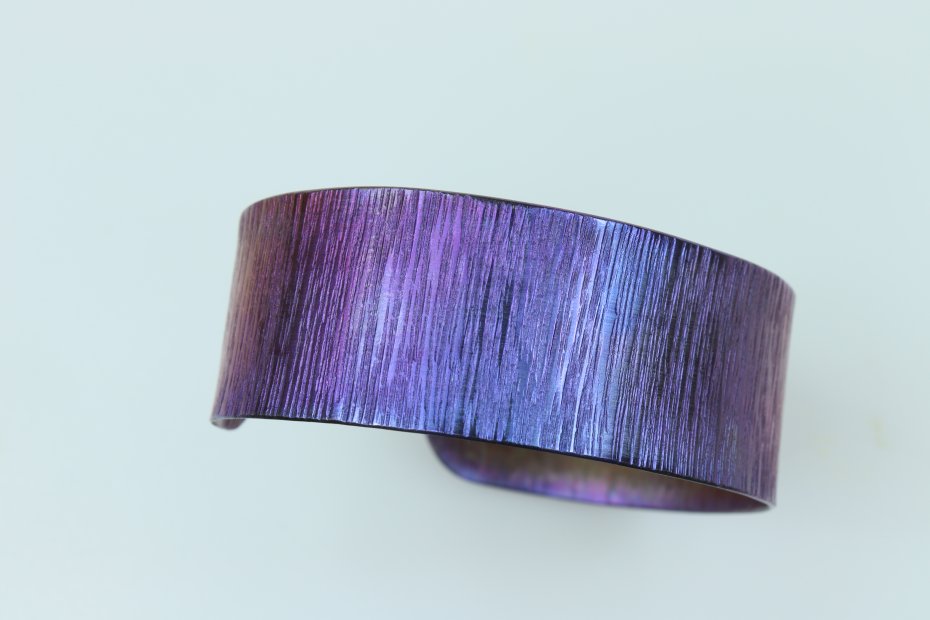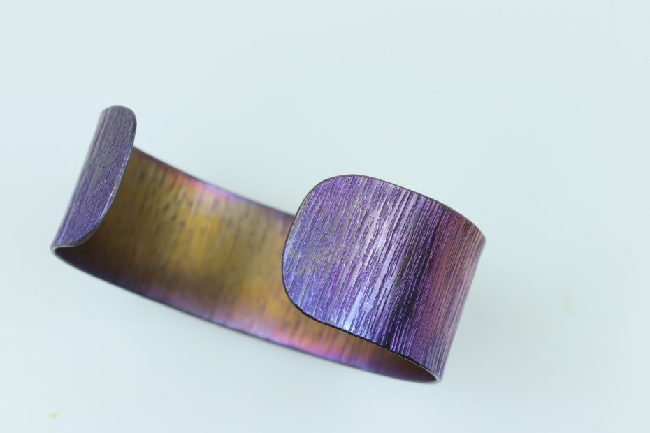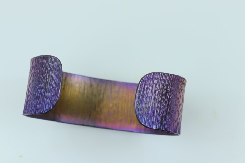 Ręcznie wykonana bransoletka z tytanu Grade I. Tytan anodowany i szczotkowany. Bransoletka jest lekka (18 g) i hipoalergiczna. Szerokość bransoletki 2.5 cm a średnica 7 cm. Obwód całkowity 20.5 cm (17.5 cm + 3 cm). Możliwość niewielkiej regulacji. Piękny głęboki fioletowy kolor.