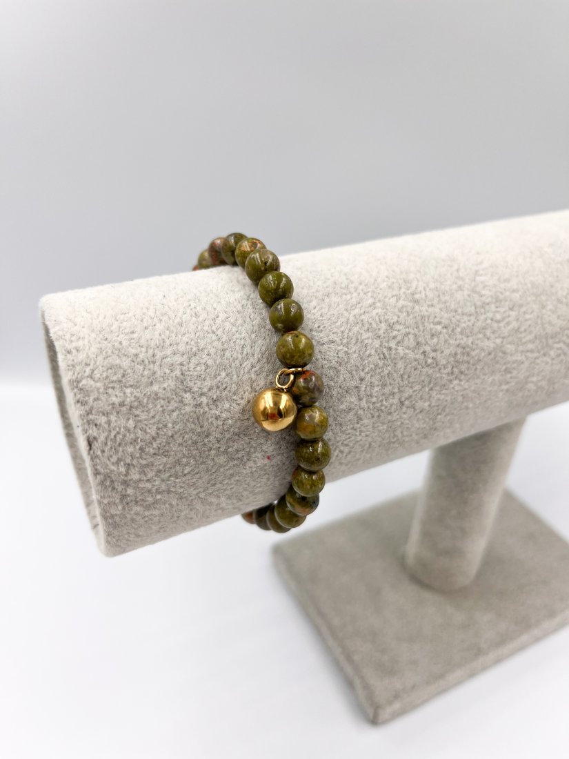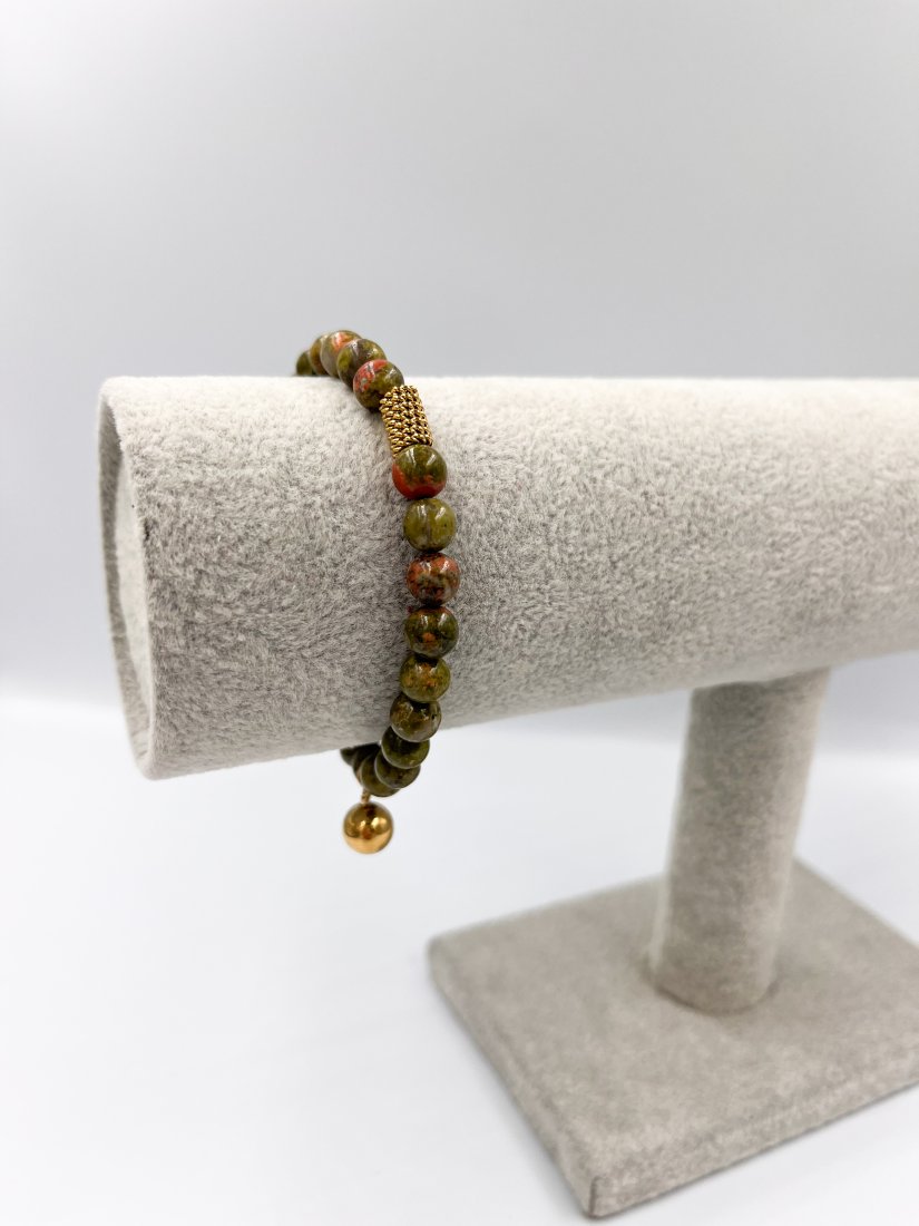 Przepiękna bransoletka z niesamowitego kamienia naturalnego, jakim jest unakit. Połączenie barw jest wyjątkowe i tworzy wyjątkowe stylizacji. Łączenie ze sprężynki ze stali szlachetnej i zawieszką kulą, która również wykonana jest ze stali szlachetnej.