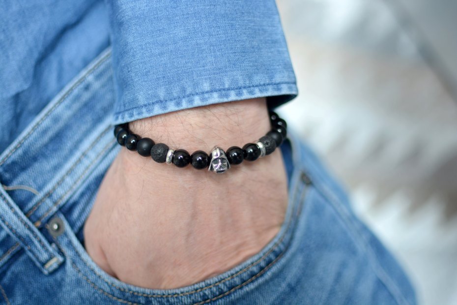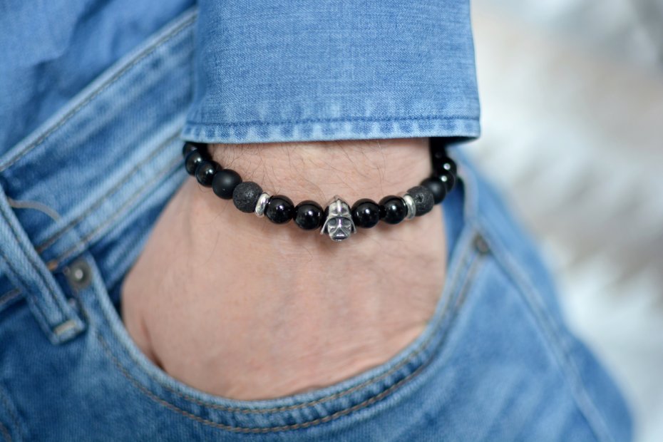 W męskim stylu, wygodna (zarówno w noszeniu jak i zakładaniu) bransoletka wykonana z kulek (śr.8mm) czarnego turmalinu (szerl), lawy wulkanicznej, onyksu (część kulek ma matowe wykończenie) oraz elementów przekładkowych ze stali szlachetnej nanizanych na mocną, silikonową gumkę. Główną ozdobę bransoletki stanowi hełm Dartha Vadera ze stali szlachetnej.