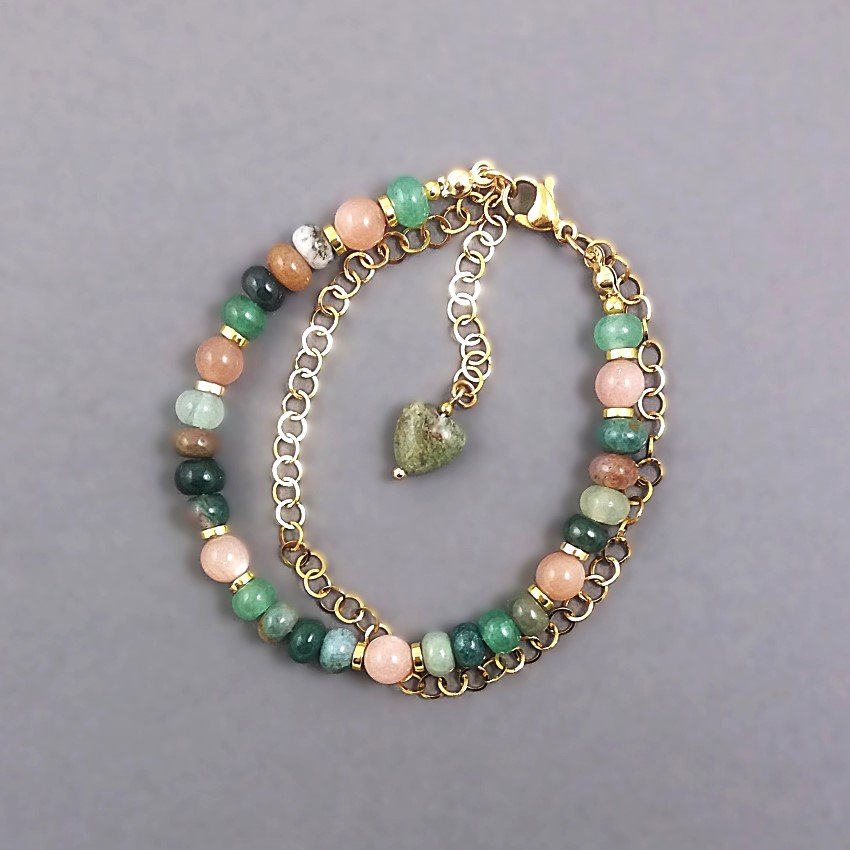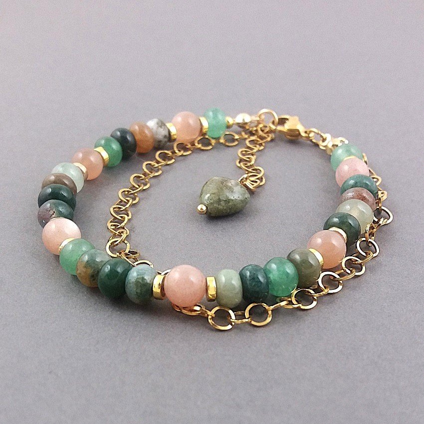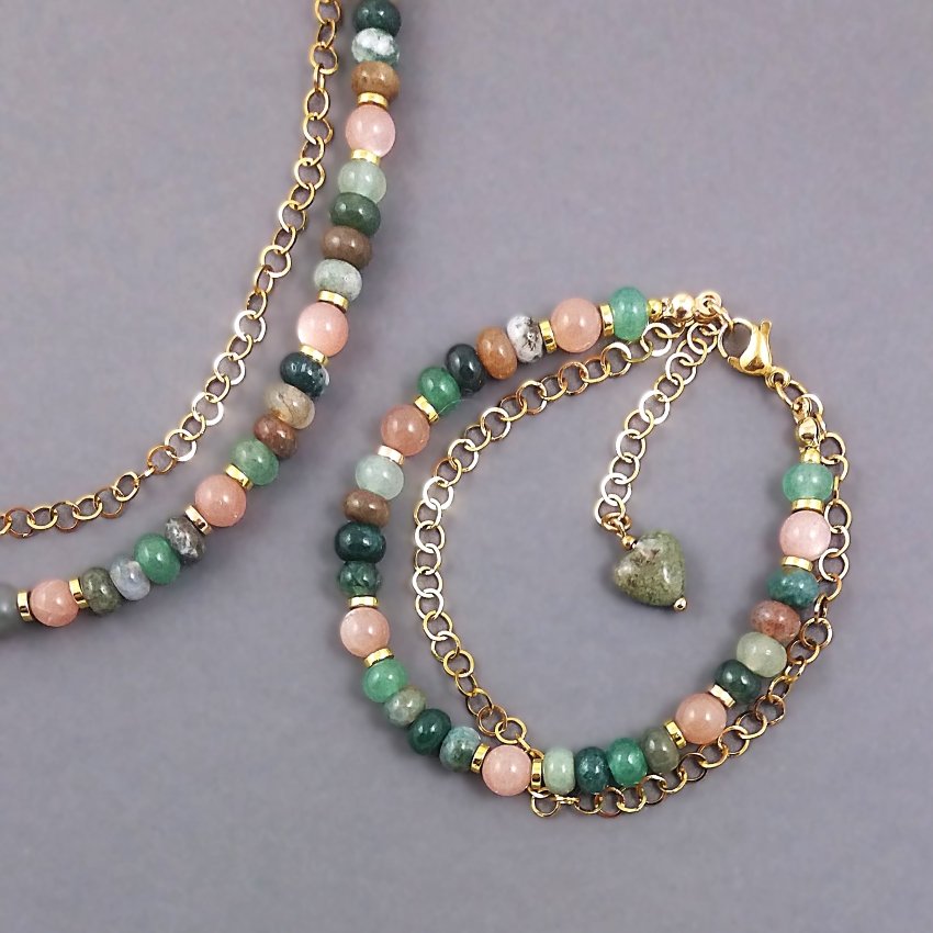 Bransoletka z gładkich oponek agatu indyjskiego, w zgaszonych kolorach zieleni i brązu (każdy kamień jest inny) i gładkich kulek kamienia słonecznego, pięknie mieniącego się połyskiem, dodającego całości radosnego blasku. Dopełnieniem tegoż, jest też łańcuszek z nieuczulającej, pozłacanej stali szlachetnej i przekładki ze złotego hematytu. Kamienie mają średnicę 6mm.