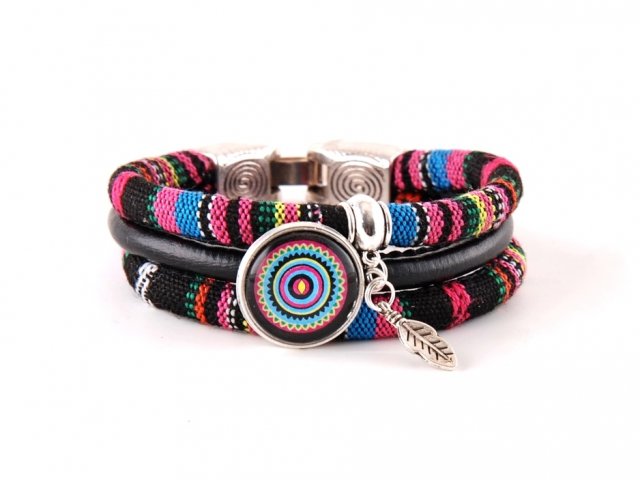Ta ciekawa bransoletka w modnym stylu boho, w etniczne wzorki jest wykonana z wzorzystego rzemienia z tkaniny oraz czarnego ze skóry eko.