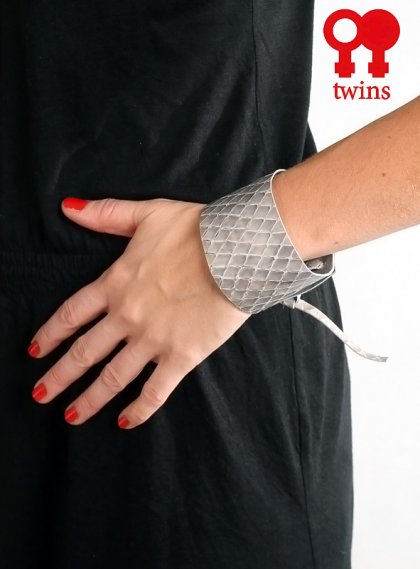Efektowna bransoleta wykonana w całości ze skóry naturalnejl lakierowanej w kolorze szarym w motyw wężowej skóry