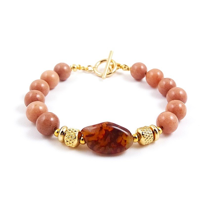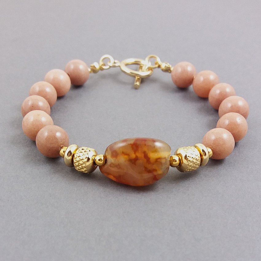 Elegancka bransoletka z naturalnych kamieni, gładkich kulek jadeitu, w pięknym kolorze ciepłego beżu i oryginalnej bryłki agatu, lekko przezroczystego o ciekawym wybarwieniu. Jadeity mają średnicę 8mm, a agat ma wymiary ok.1,2 x 2cm.