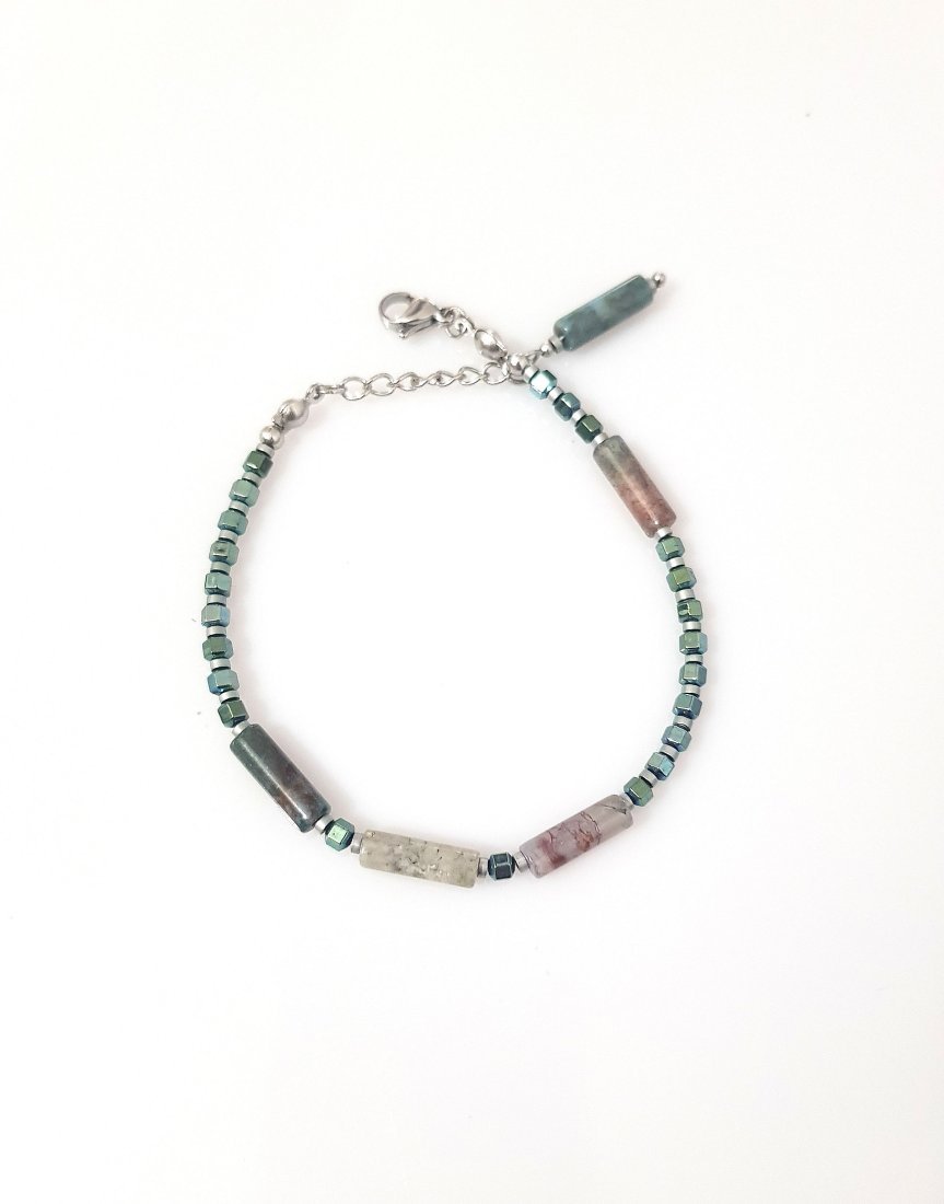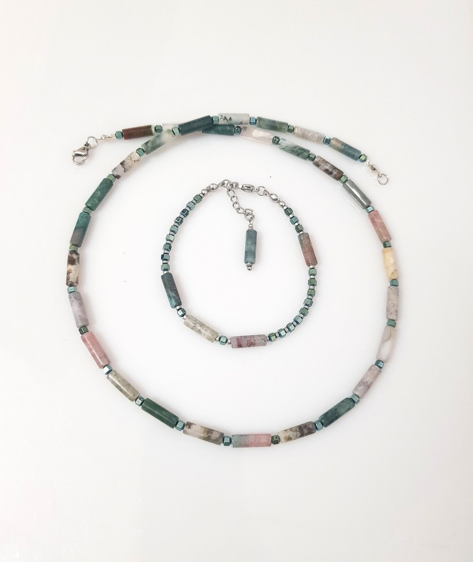 Agat indyjski w zachwycających kolorach ziemi i dodający industrialnego charakteru jasno zielony błyszczący hematyt.