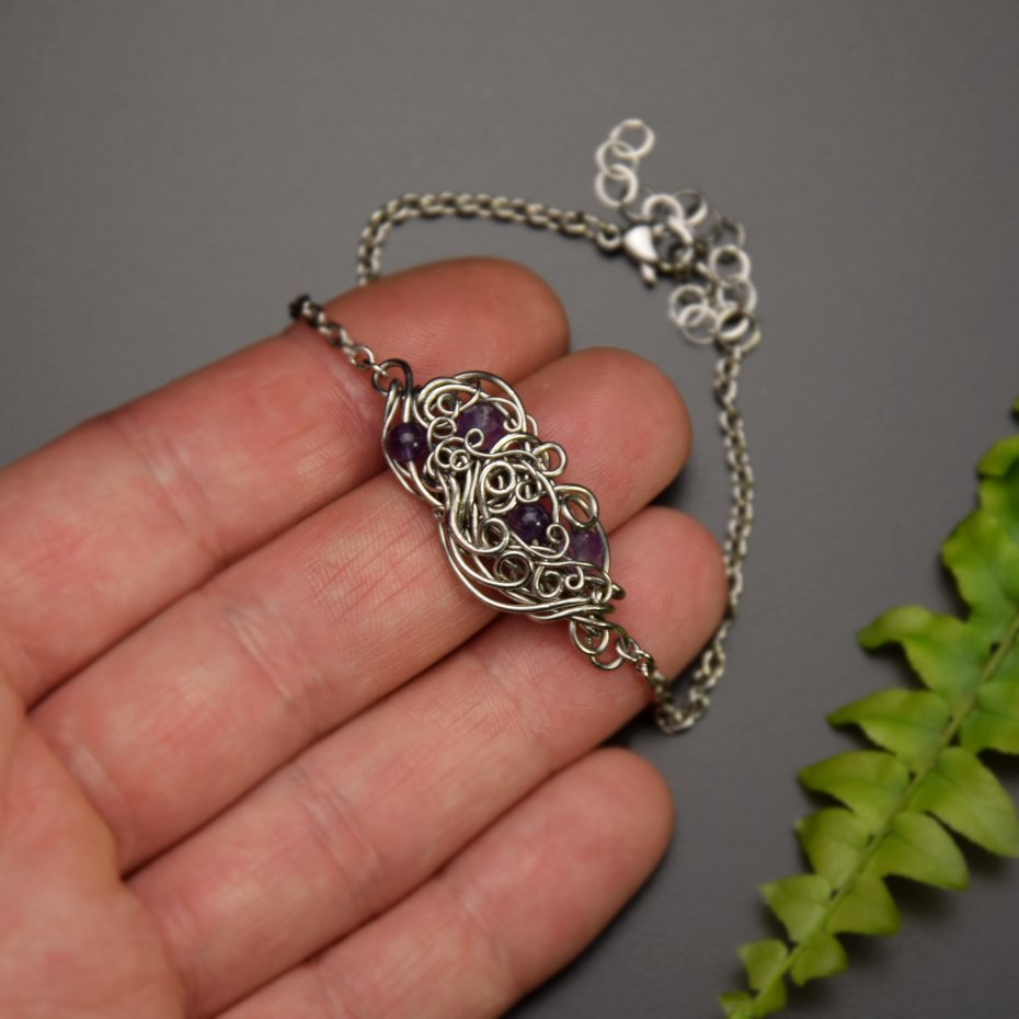 Ręcznie robiona bransoletka z małymi kulkami fioletowych ametystów. Element ozdobny wykonany został techniką wire wrapping w całości ze stali chirurgicznej.