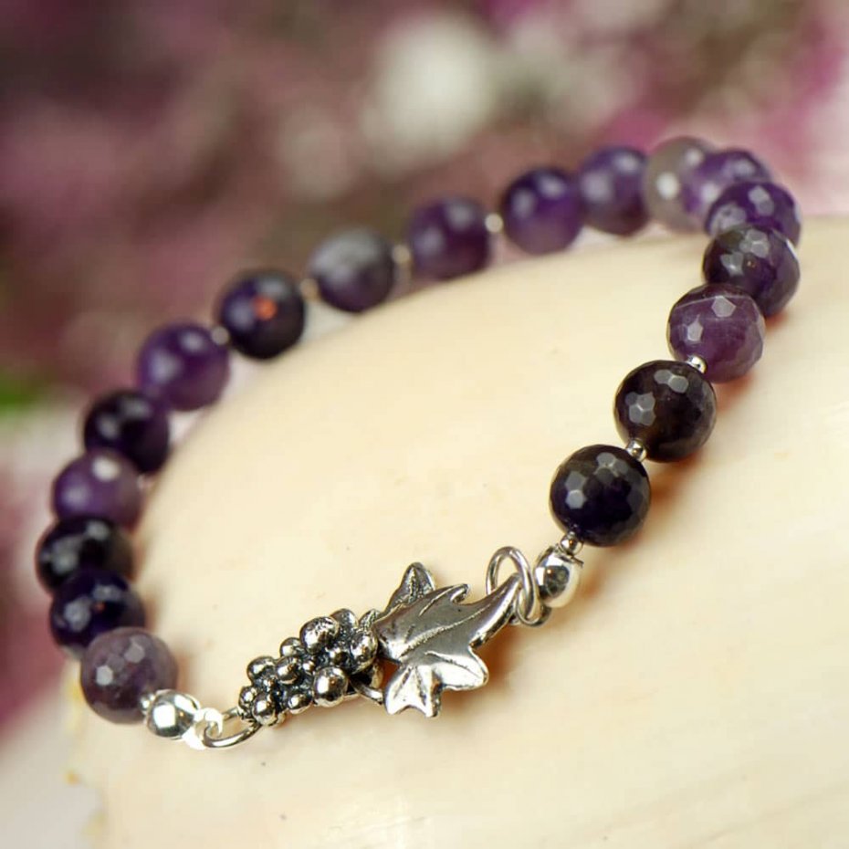 Srebrna bransoletka z fasetowanych ametystów powstała w autorskiej pracowni Artseko. Będzie stanowiła idealny dodatek do stylizacji kobiecych, biznesowych i wieczorowych. Srebrne elementy były przecierane i oksydowane w celu nadania bransoletce niepowtarzalnego charakteru. Bransoletka jest dodatkowo urozmaicona zapięciem w kształcie winogrona.