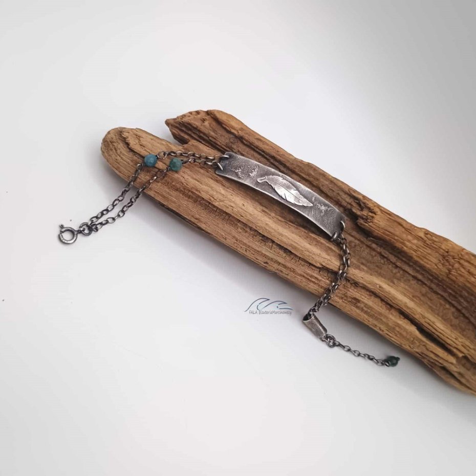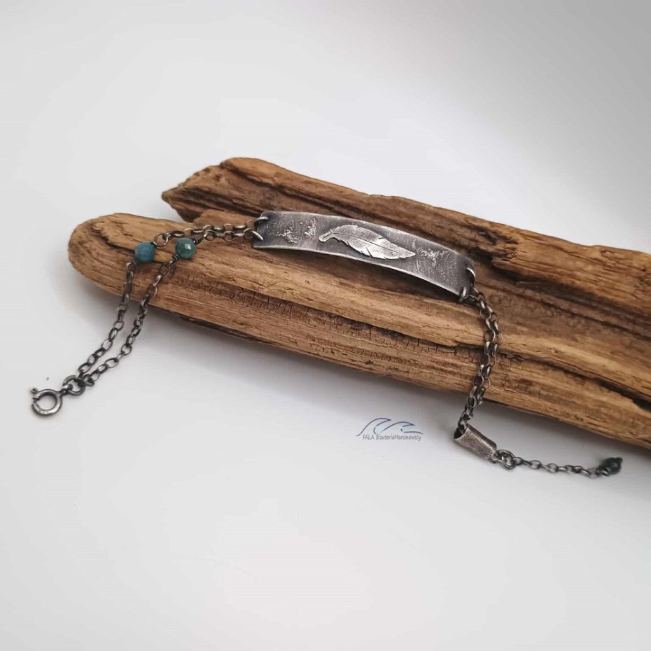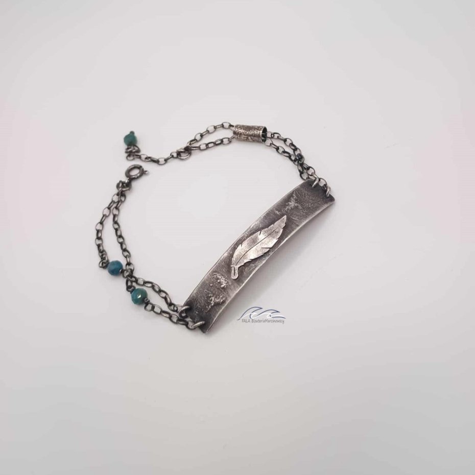 Bransoletka wykonana ręcznie ze srebra pr 925, oraz fasetowanych apatytów. Bransoletka delikatna, lekka i efektowna zarazem w stylu surowym. Szerokość bransoletki z przodu - 0,9 cm. Długość przodu z piórkiem - 5 cm. Całkowita długość bransoletki - 17 cm + 3 cm łańcuszek do regulacji.