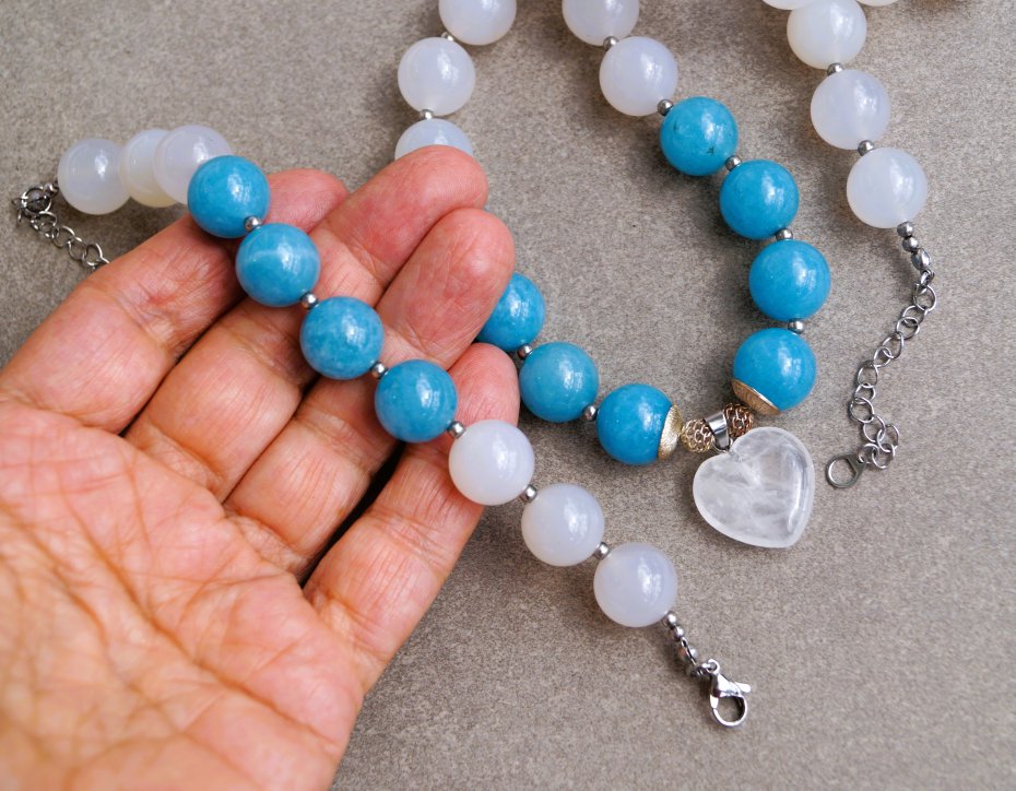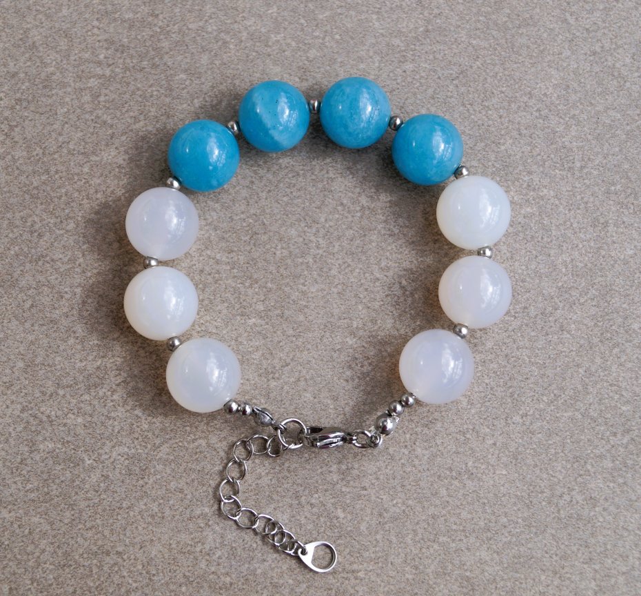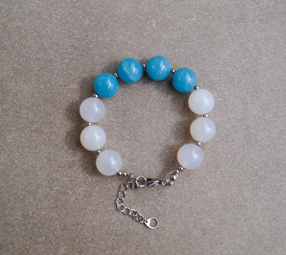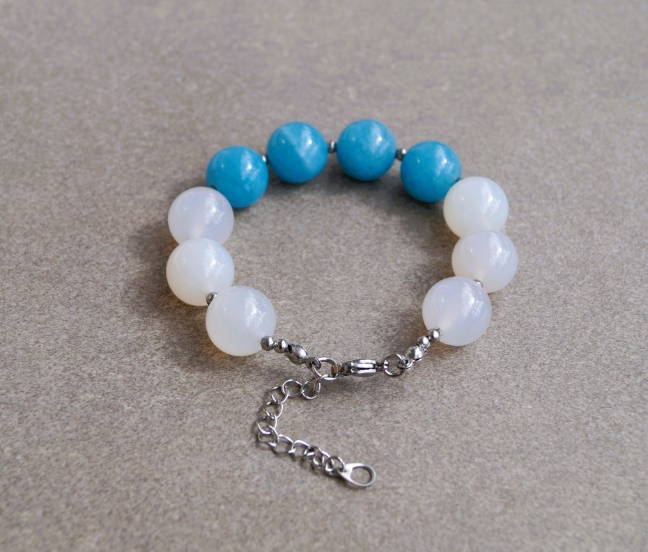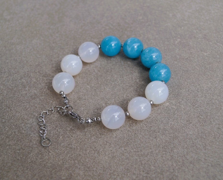 Elegancka bransoletka wykonana z naturalnych kamieni – białego jadeitu oraz niebieskiego kwarcu, w formie gładkich kulek o średnicy 14 mm. Bransoletka została wykończona solidnym zapięciem na karabińczyk z regulowaną przedłużką wykonaną ze stali szlachetnej, co gwarantuje wygodę i trwałość. Całość zapakowana jest w eleganckie pudełko, dzięki czemu doskonale sprawdzi się jako gotowy prezent na wyjątkową okazję.
