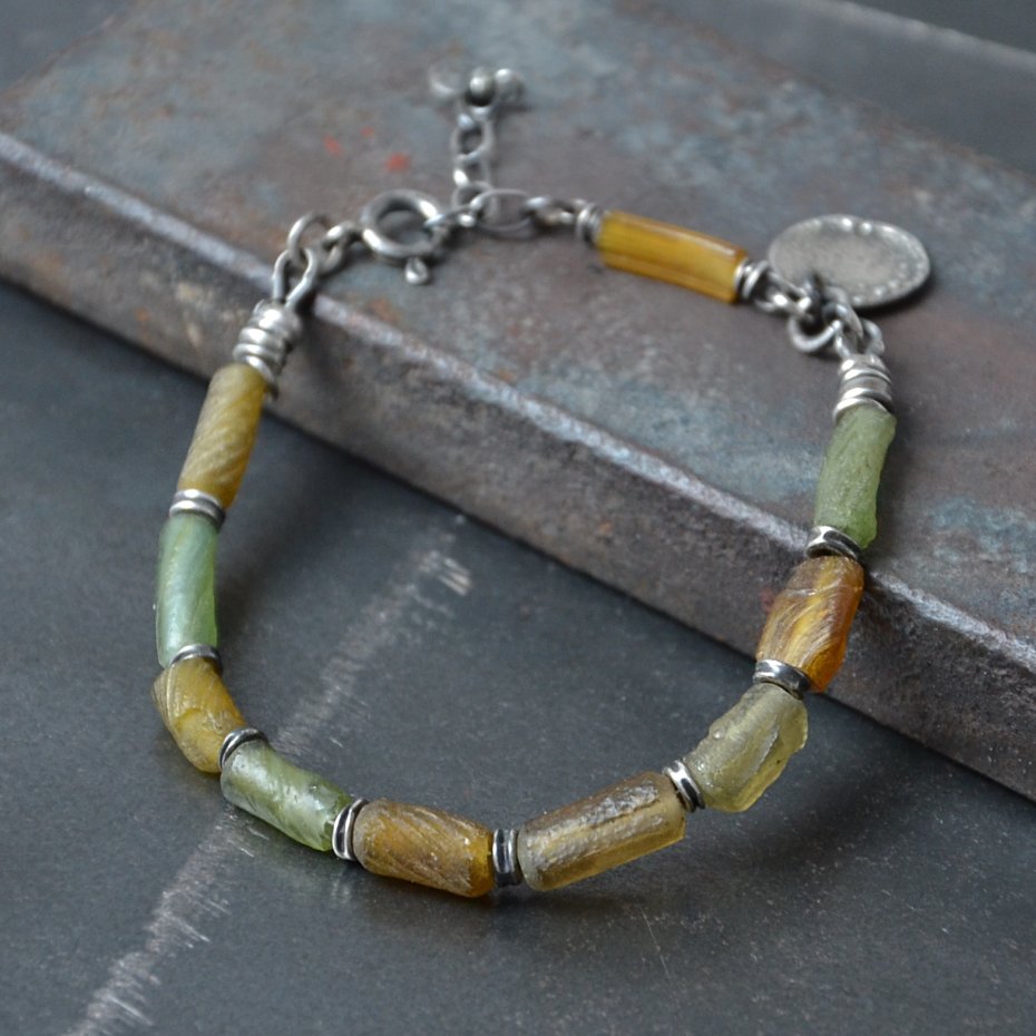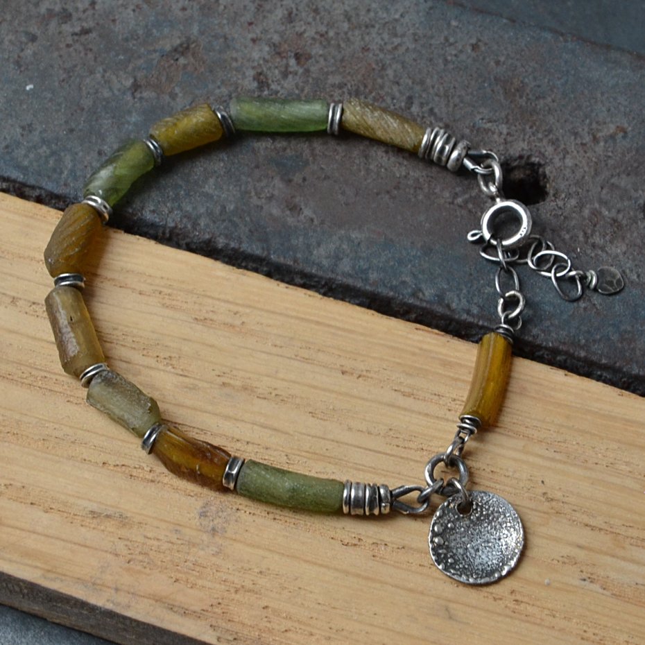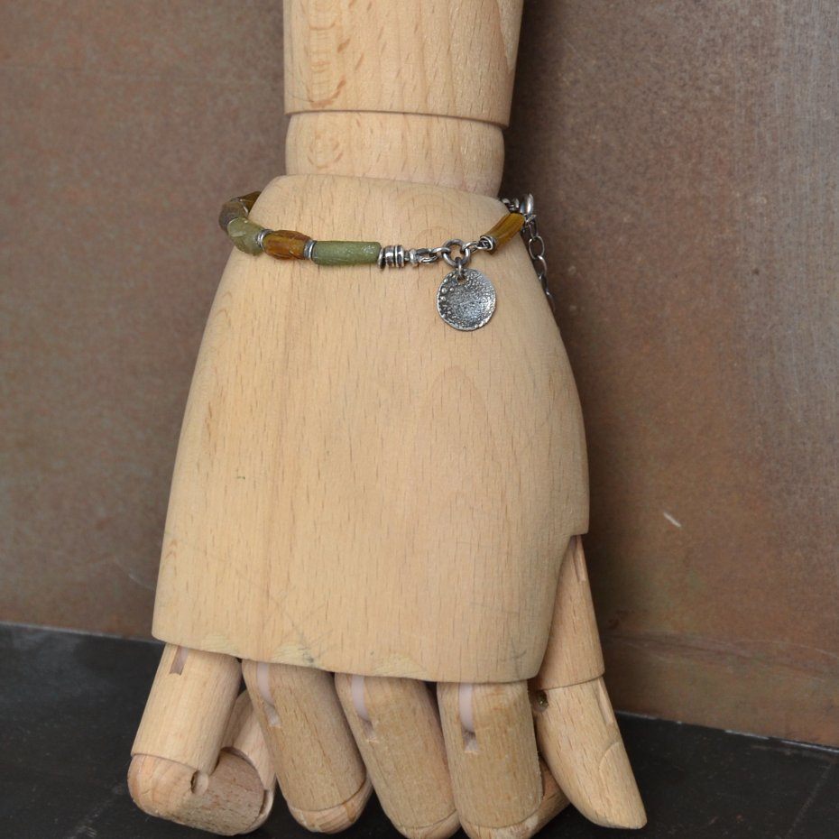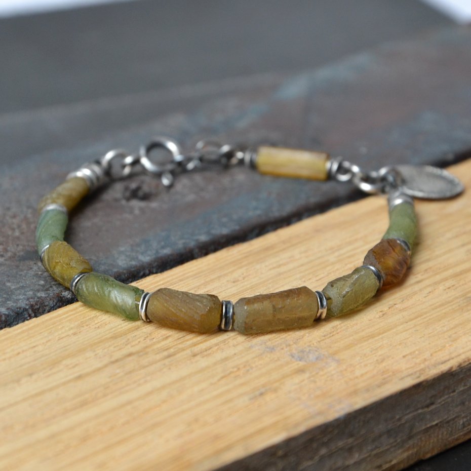 Prosta, jednorzędowa bransoletka wykonana z kawałków szkła antycznego w kolorze zielonym i brązowym w połączeniu z oksydowanym srebrem o surowym wykończeniu.