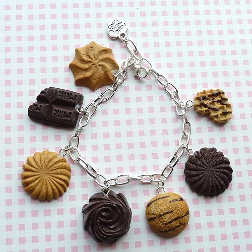 Oryginalna i słodka bransoletka z zawieszkami w formie ciasteczek i czekoladek:) długość bransoletki regulowana, długość każdej zawieszki to ok. 1,5-2cm. Wysyłam ozdobnie zapakowaną;)