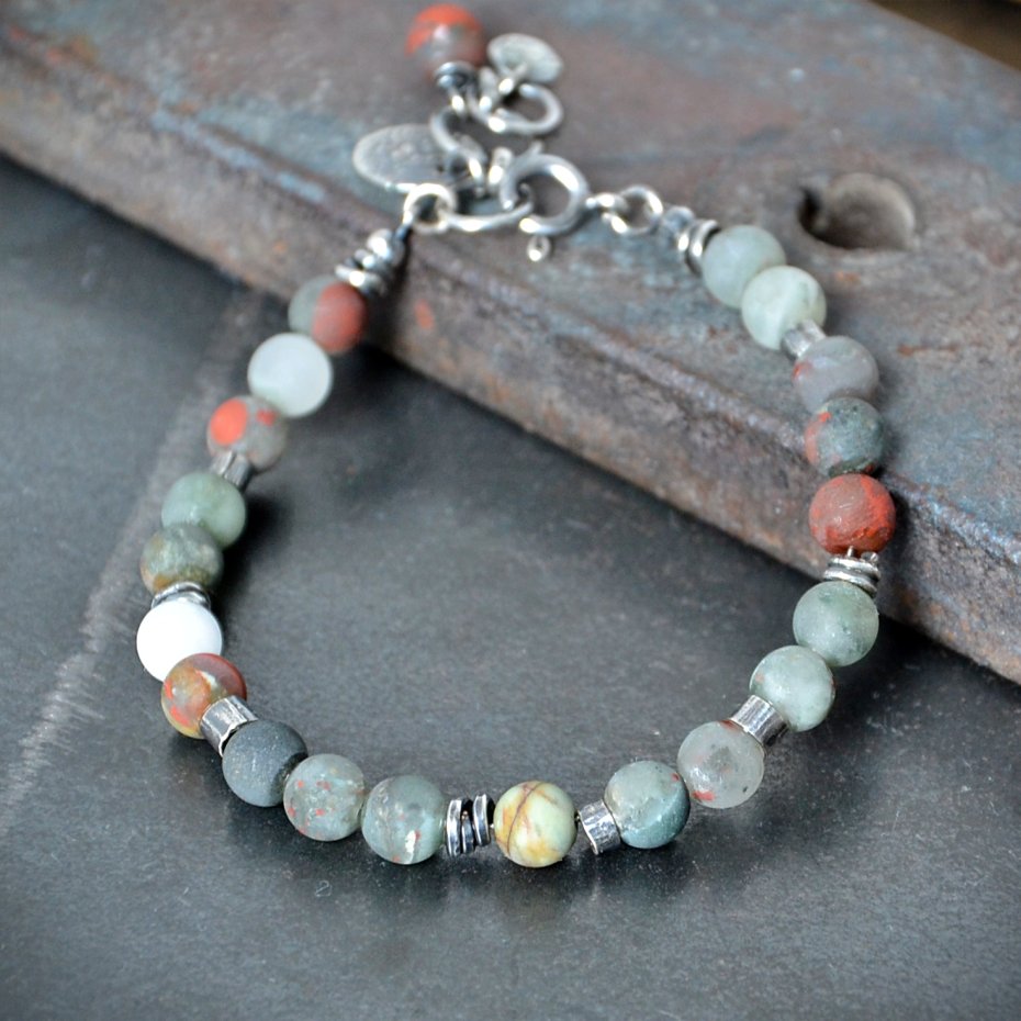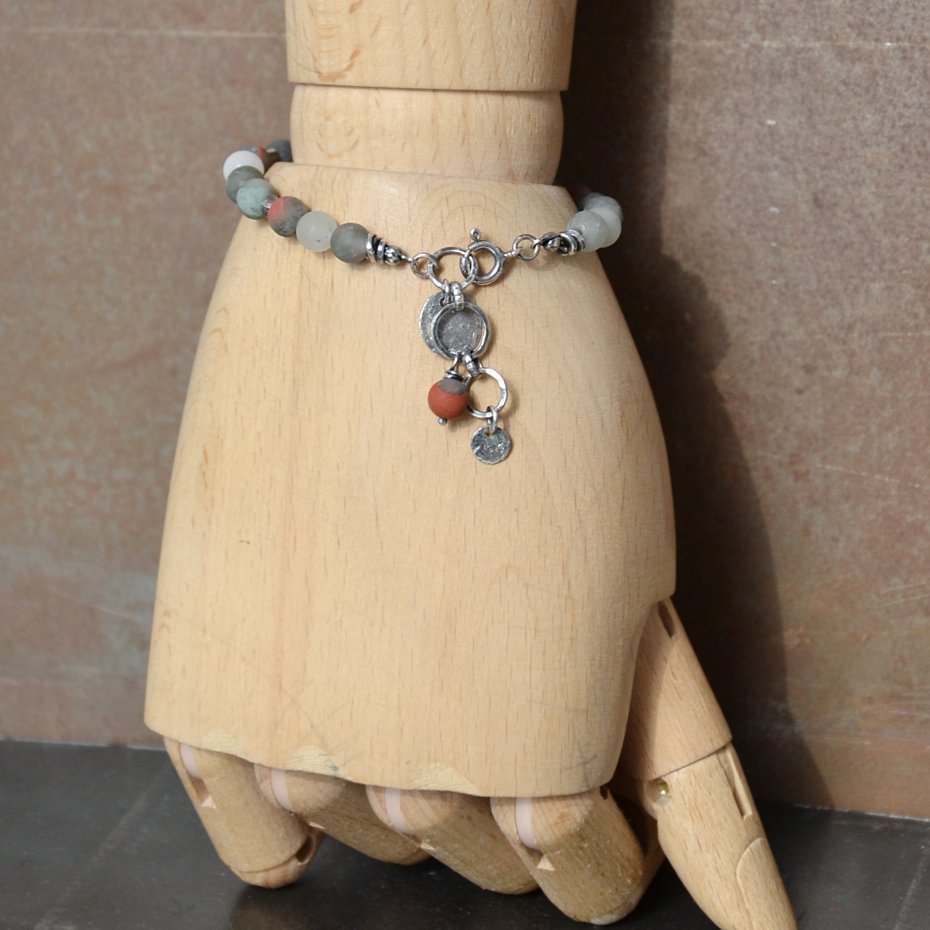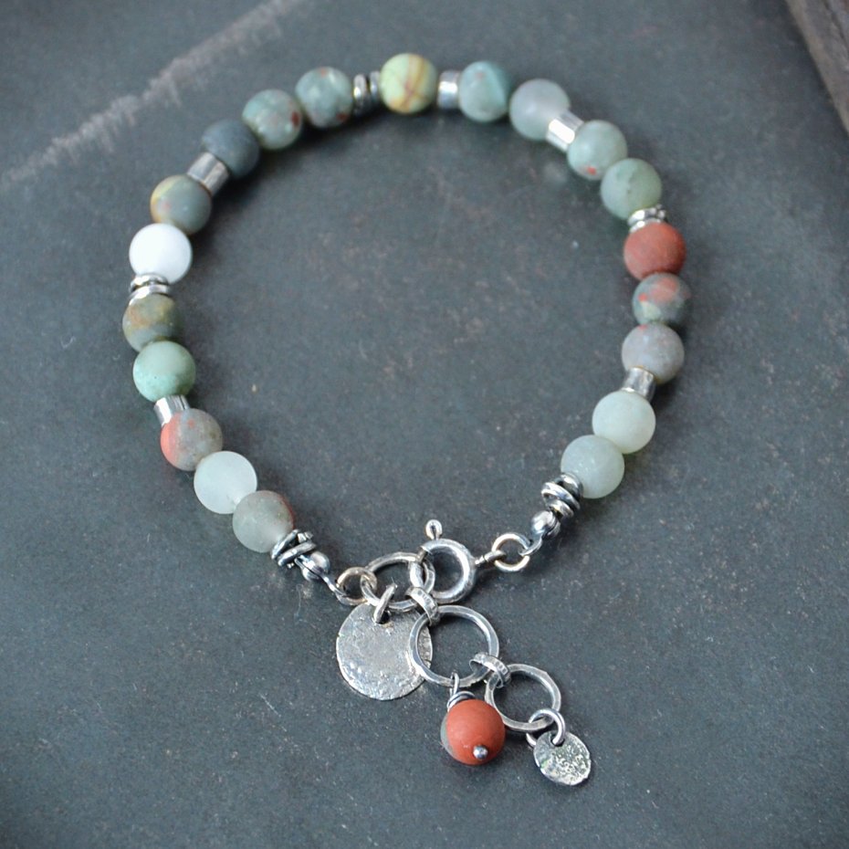 Bransoletka została wykonana z kul matowego heliotropu w odcieniach szarości z charakterystycznymi czerwonymi wtrąceniami tlenku żelaza. Kamienie uzupełnia ręcznie formowane srebro.
