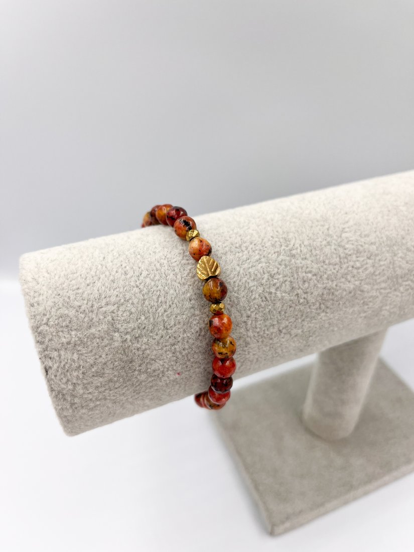 Przepiękna bransoletka z nieoczywistego jadeitu. Przepiękny mix barw w połączeniu z listkami z hematytu to idealny dodatek do wielu stylizacji.