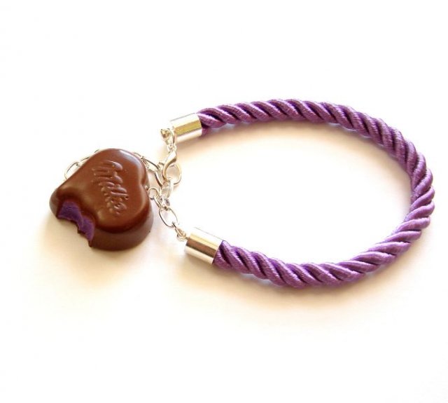 Słodka bransoletka z fioletowego plecionego sznurka ze czekoladowym serduszkiem milka wykonanym z masy termoutwardzalnej fimo.