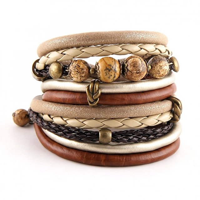 Ozdobą bransoletki są naturalne kamienie - jaspisy krajobrazowe, które ujęte są w rzędzie rzemieni i na stałe przymocowane.