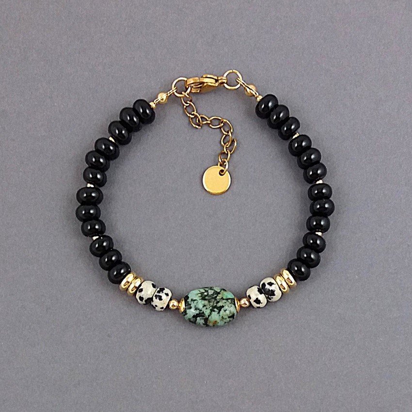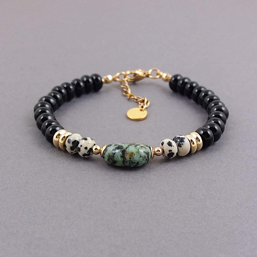 Bransoletka z naturalnych kamieni: gładkich oponek czarnego onyksu i jaspisu dalmatyńskiego o średnicy 6mm. Centralnie umieszczona jest bryłka unikalnego, pięknego turkusu afrykańskiego (jaspisu zielonego), o wymiarach ok.10 x 14mm. Przekładki i wykończenie z nieuczulającej, pozłacanej stali szlachetnej.