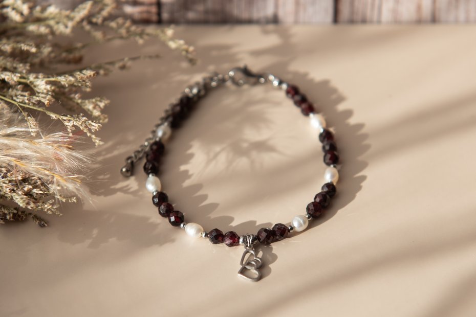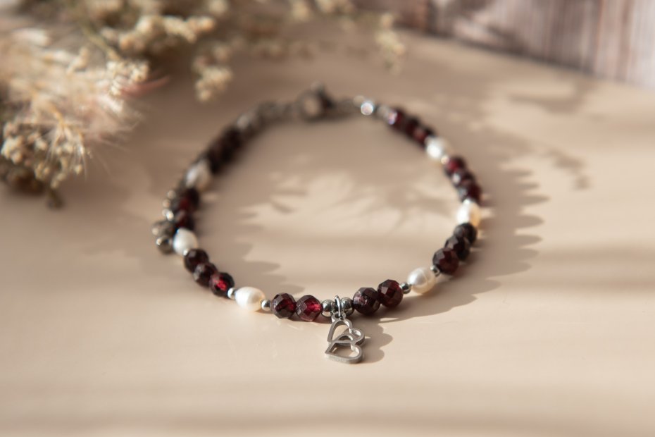 Tagi: #bransoletka z kamieni, #granat, #perła słodkowodna, #serce walentynki