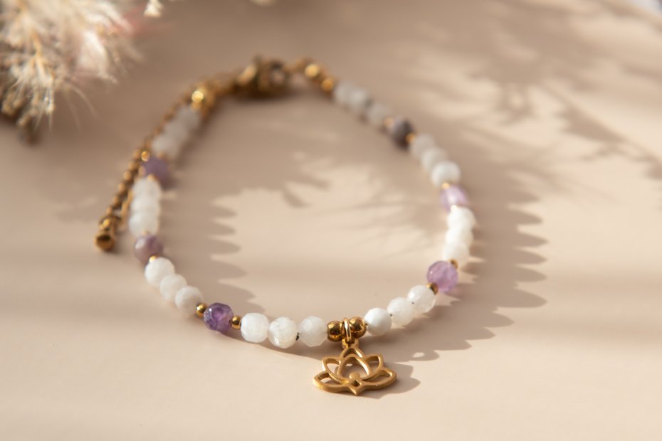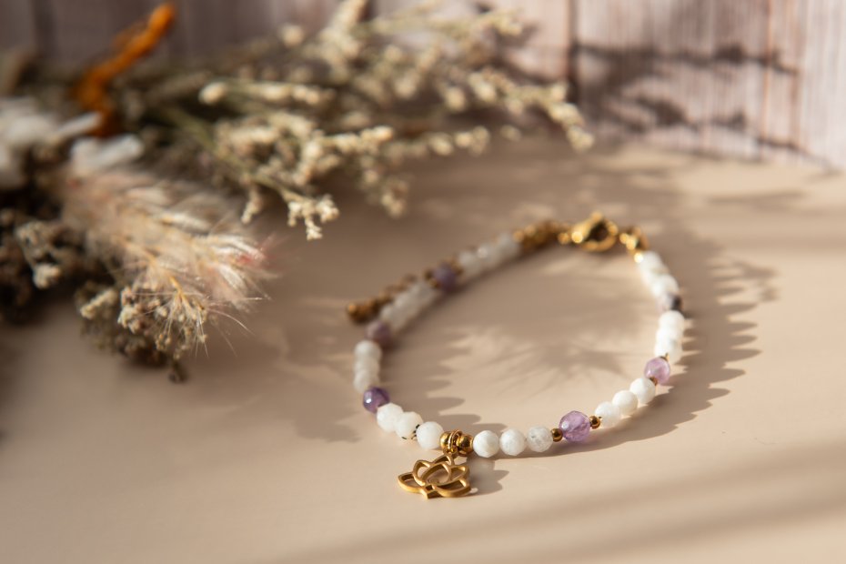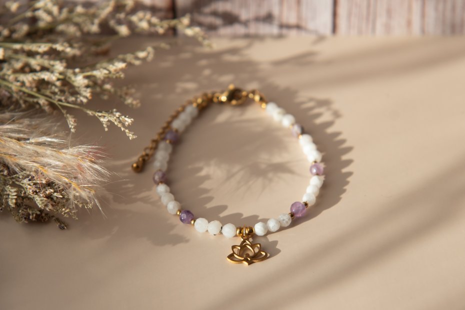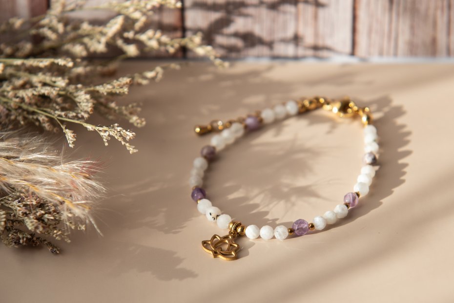 Tagi: #ametyst, #bransoletka z kamieni, #kamień księżycowy, #kwiat lotosu