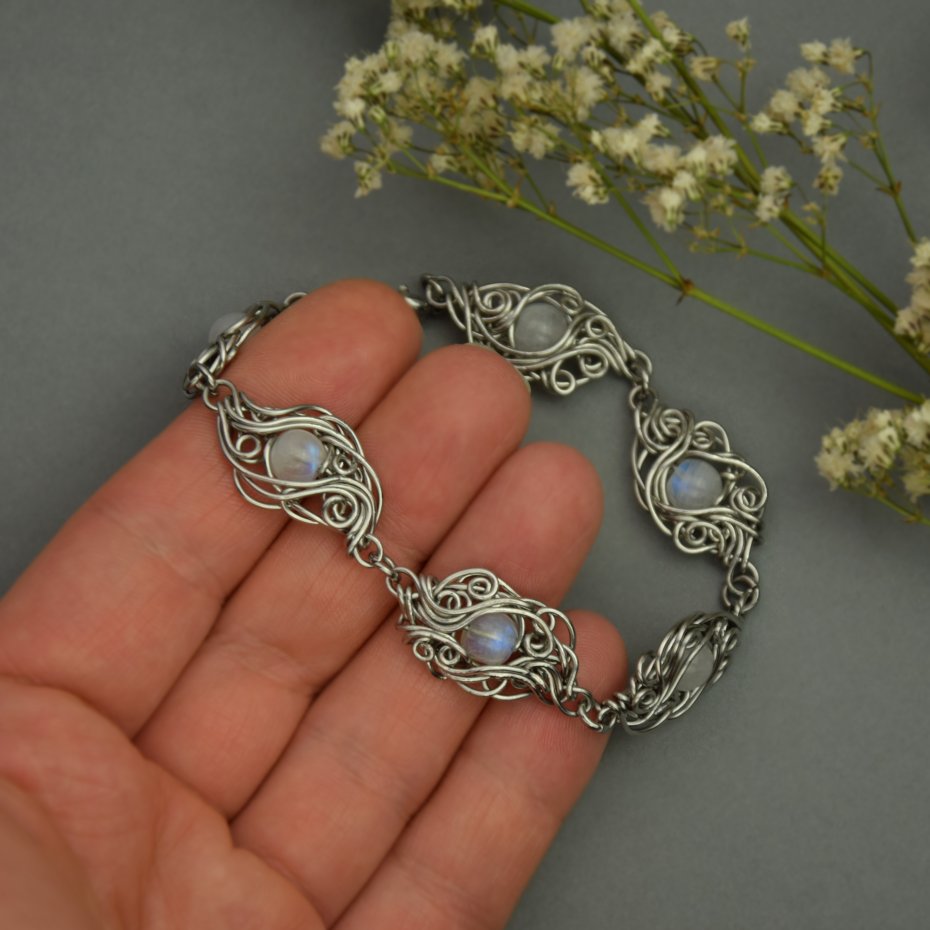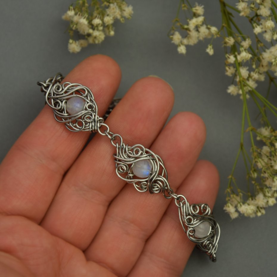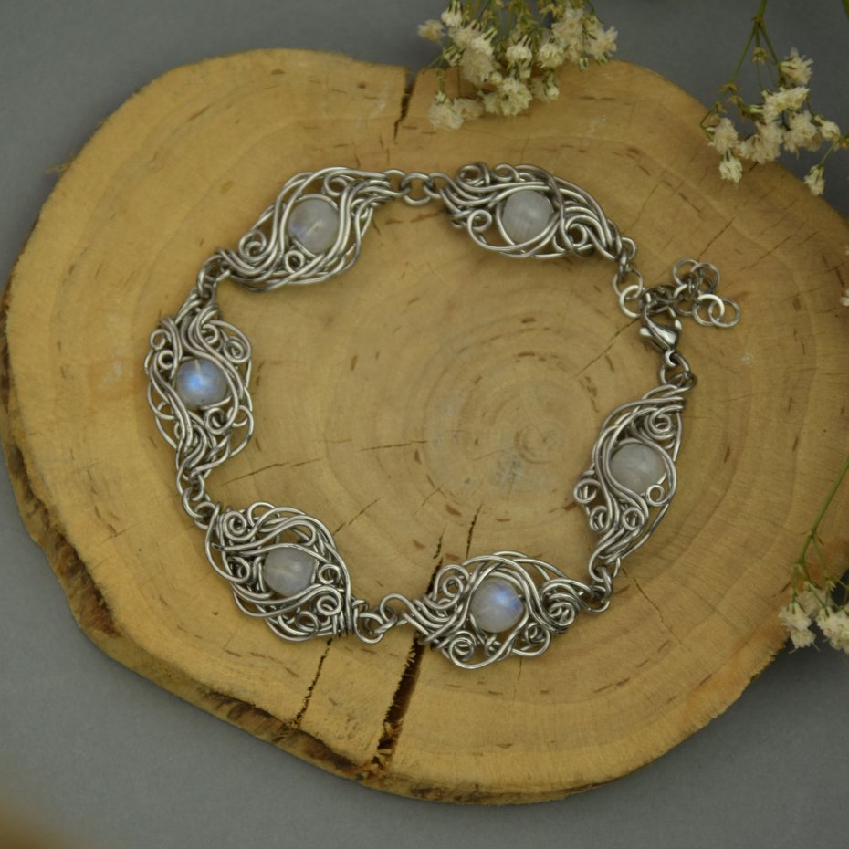 Ręcznie robiona bransoletka z pięknie połyskującymi kamieniami księżycowymi. Wykonana techniką wire wrapping z drutów ze stali chirurgicznej.