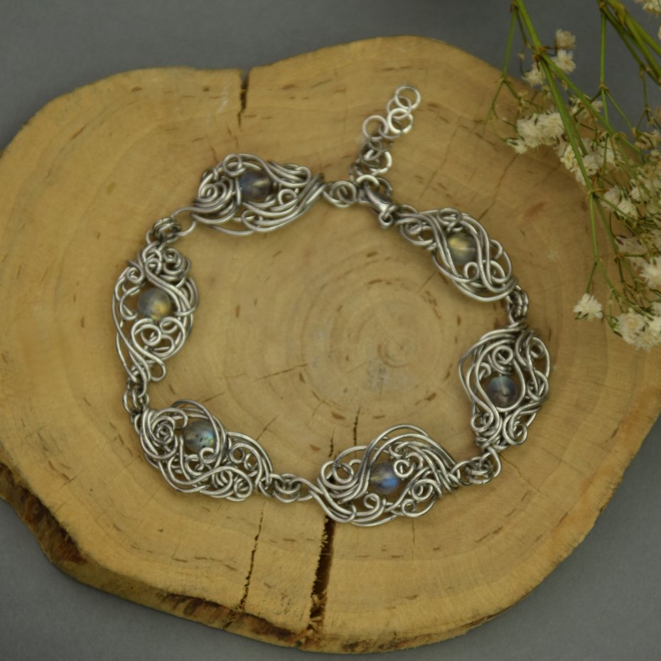 Ręcznie robiona bransoletka z pięknymi, połyskującymi na kolorowo labradorytami. Wykonana techniką wire wrapping z drutów ze stali chirurgicznej.