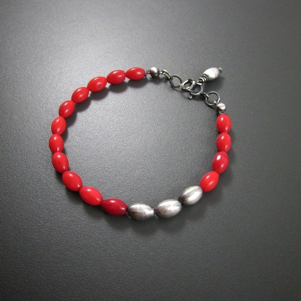 Delikatna bransoletka wykonana z ryżu korala 5/8 mm. Całość dopełnia srebro 925, oksydowane i wypolerowane. Długość bransoletki wynosi ok. 17,5 cm, plus łańcuszek regulacyjny 2 cm. Będzie pasowała na nadgarstek 15-17 cm. Elegancko zapakowana.
