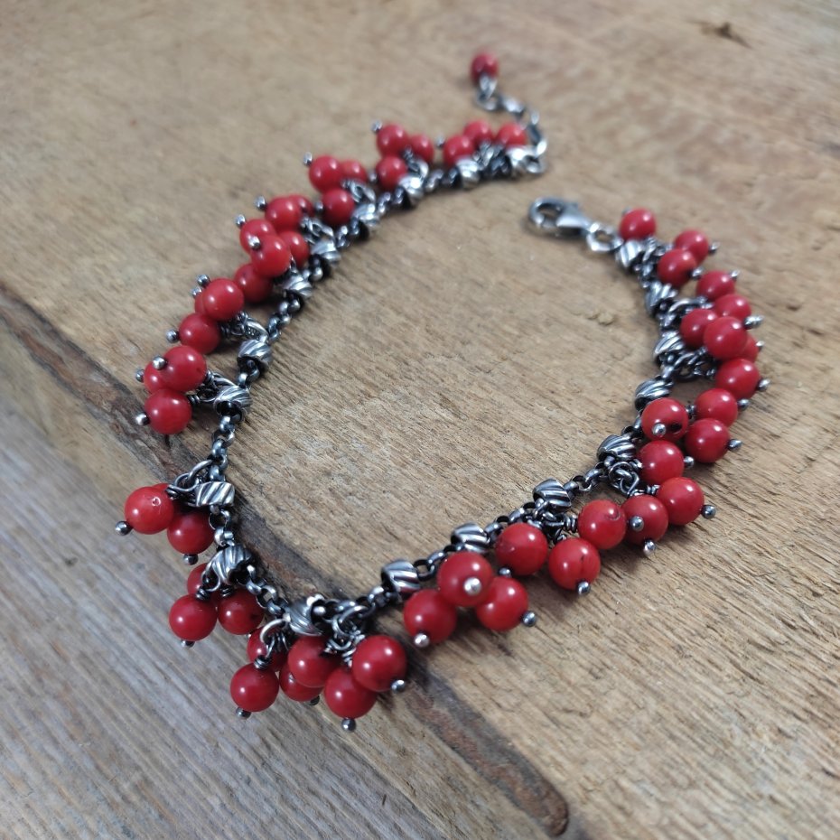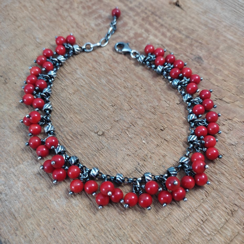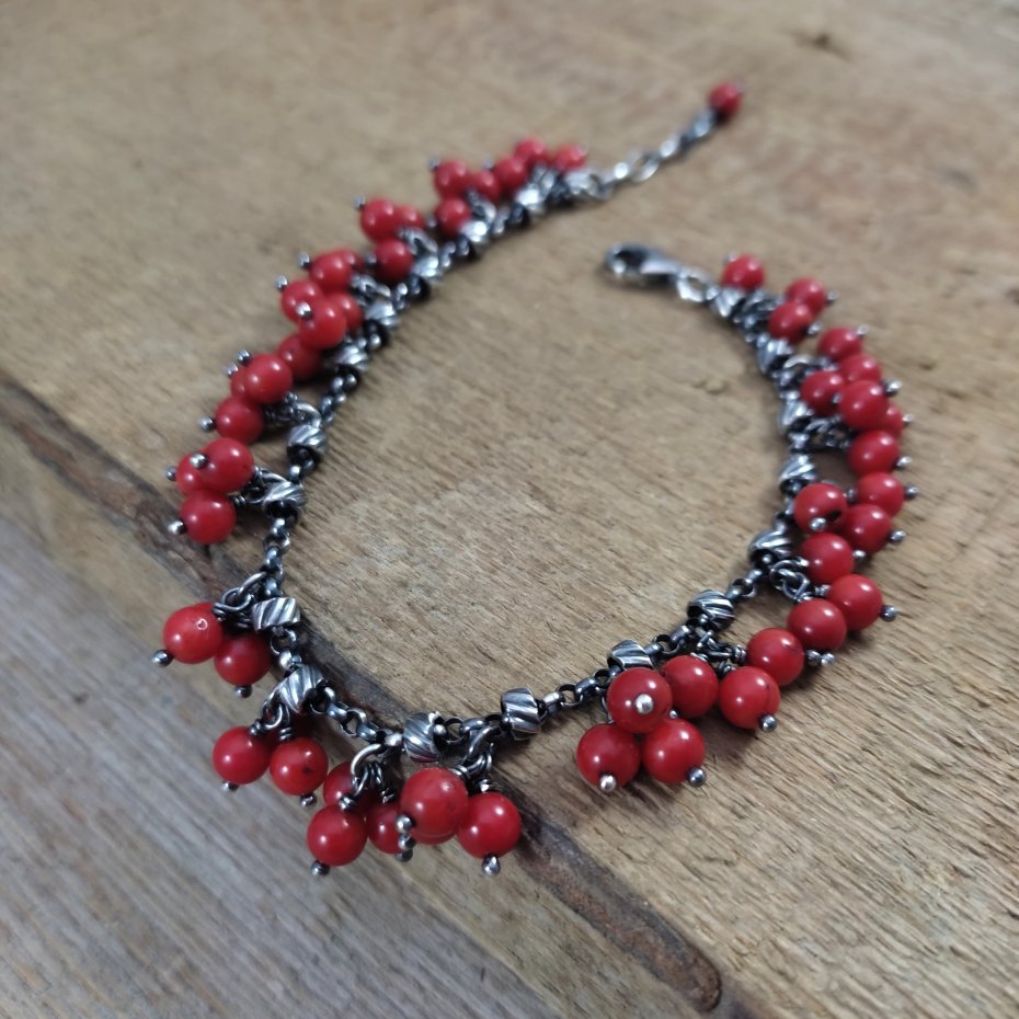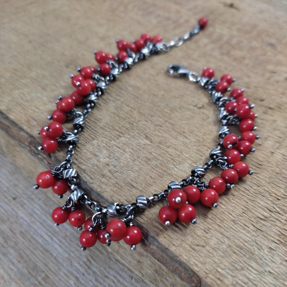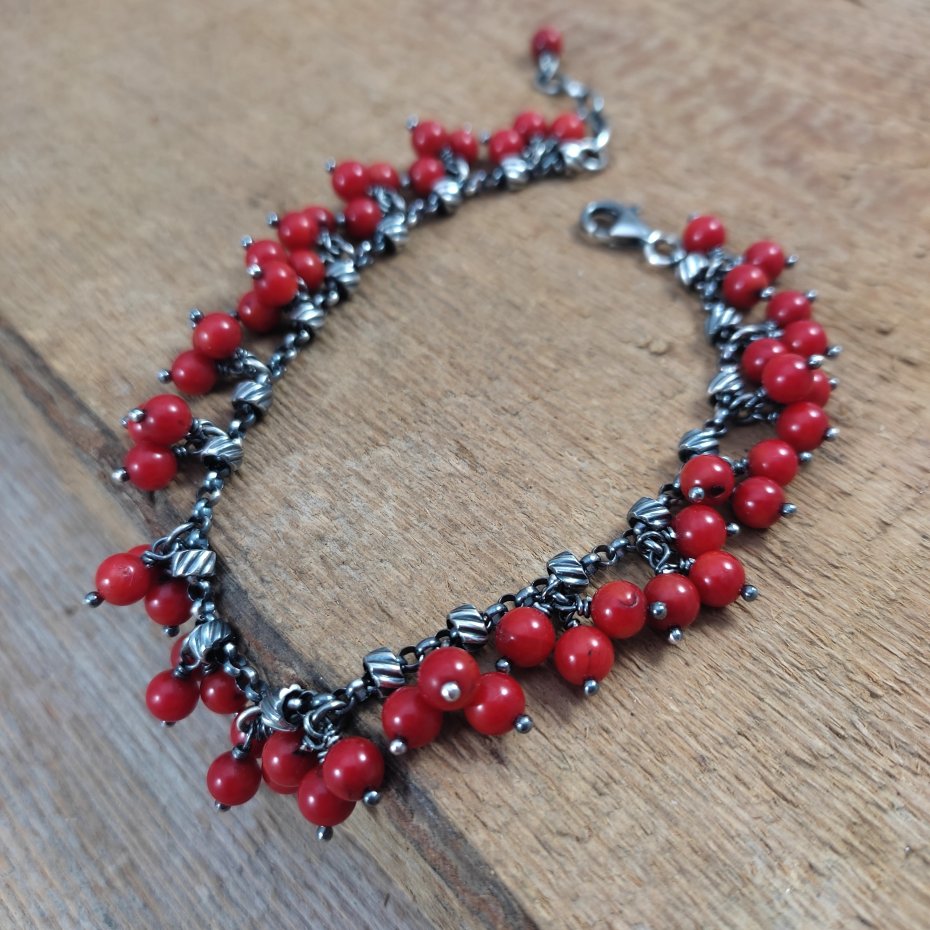 Bransoletka wykonana z kul korala 5 mm. Całość dopełnia srebro 925, oksydowane i wypolerowane.