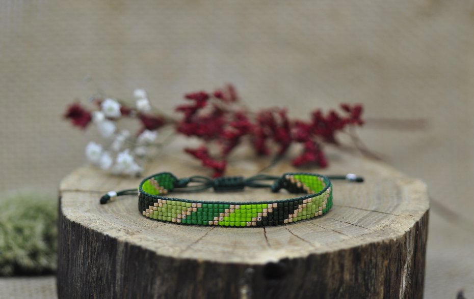 Bransoletka w odcieniach zieleni i srebra z delikatnym odcieniem różu.