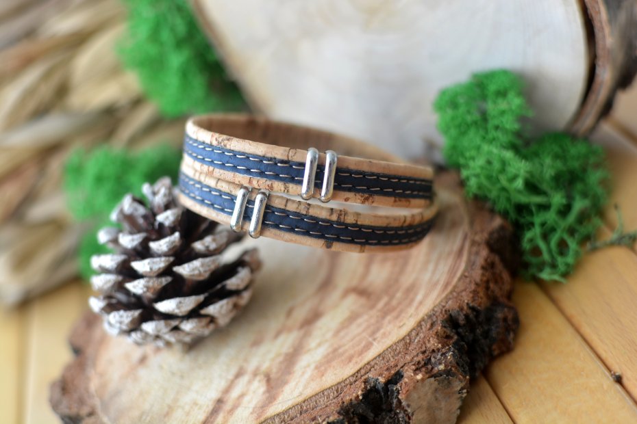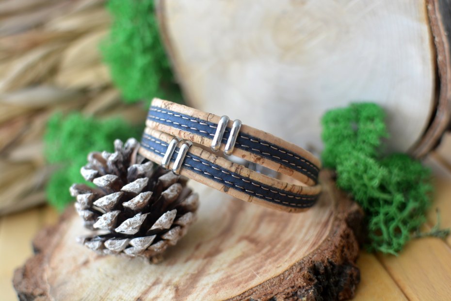Podwójnie oplatająca nadgarstek bransoletka wykonana z płaskiego rzemienia korkowego o szerokości 1cm, w kolorze naturalnym z przeszytą wstawką granatową. Ozdobiona jest przekładkami ze stali szlachetnej i wykończona zapięciem zegarkowym ze stali szlachetnej.