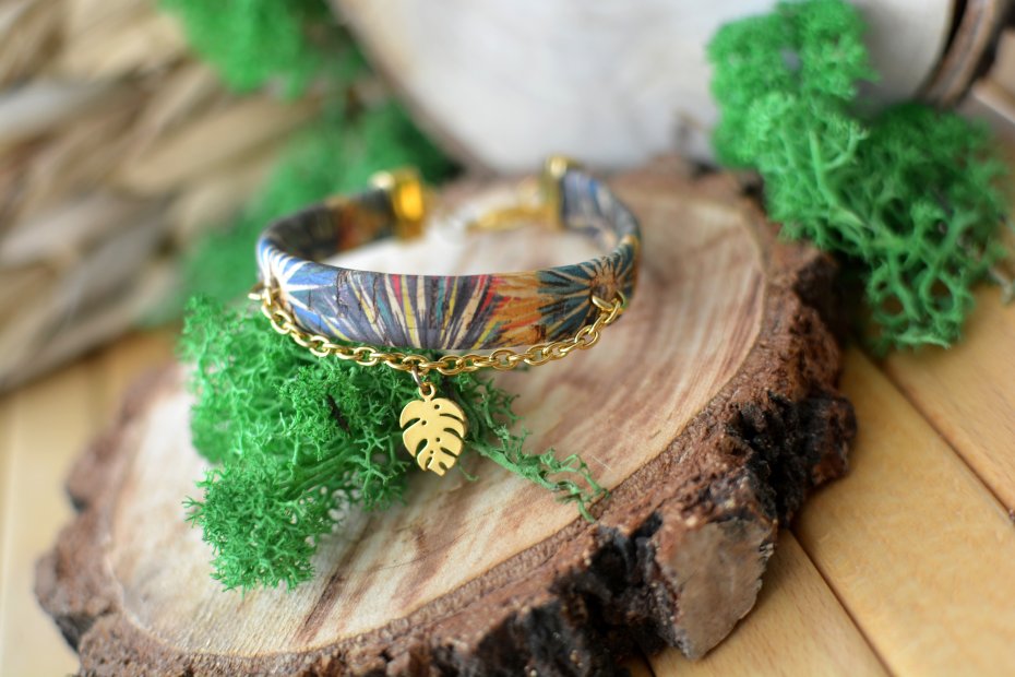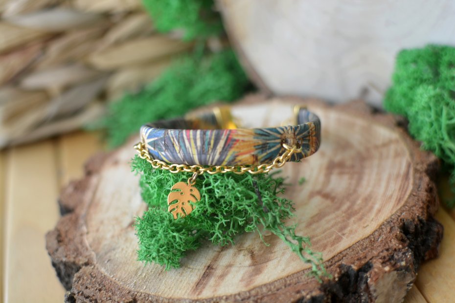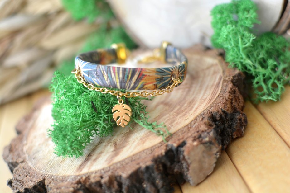Bransoletka wykonana z płaskiego, wzorzystego rzemienia korkowego o szerokości 1cm, ozdobiona założoną na łańcuszku zawieszką w kształcie liścia monstery w kolorze złotym (elementy wykonane ze stali szlachetnej).