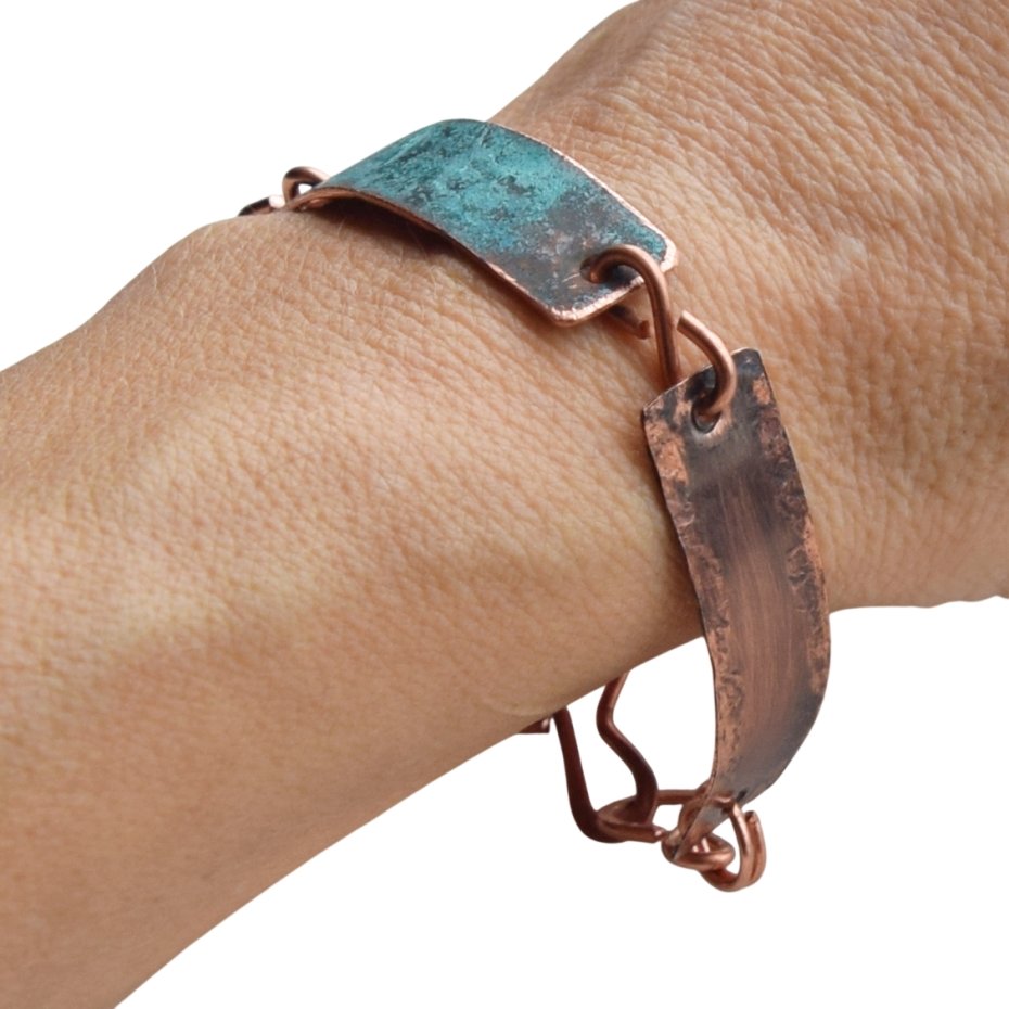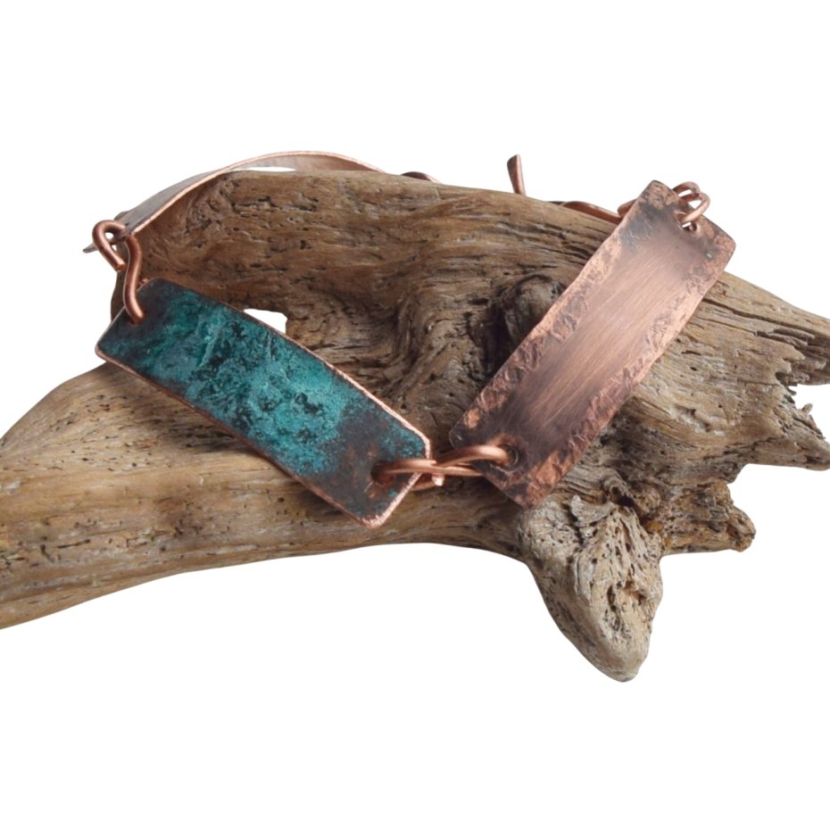 Bransoletka wykonane z kutej, oksydowanej oraz patynowanej miedzi (naturalna zielona patyna), i łańcuszka w kolorze starej miedzi.