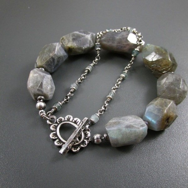 Bransoletka wykonana z fasetowanych bryłek labradorytu ok. 16-26 mm oraz fasetowanych kul apatytu 4 mm. Labradoryt posiada delikatne spękania, naturalne niedoskonałości. Całość dopełniona srebrem 925, oksydowanym i wypolerowanym. Długość bransoletki wynosi 20 cm. Pasuje na nadgarstek 15,5-16,5 cm. Elegancko zapakowana.