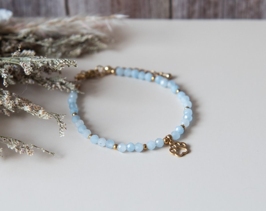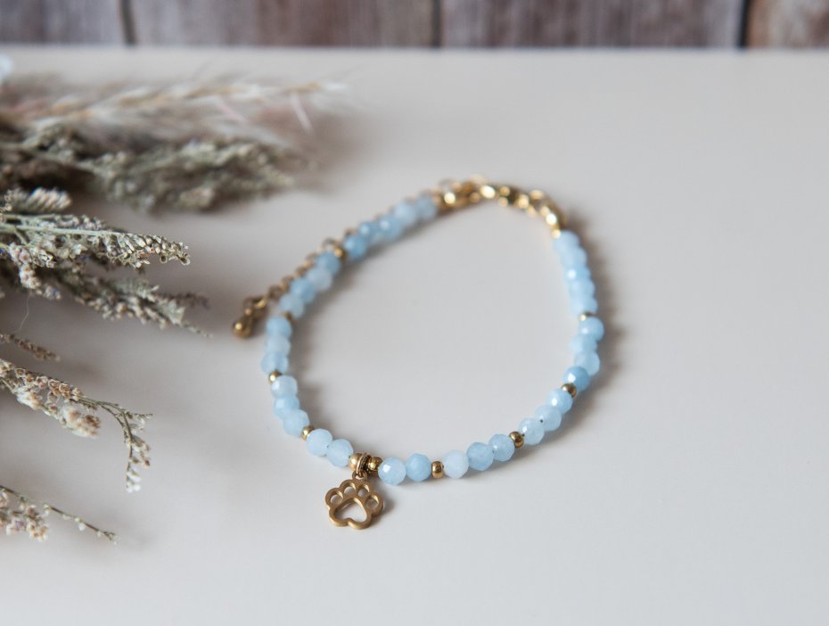 Bransoletka idealna dla każdej miłośniczki zwierząt, wykonana z kamieni - akwamaryn fasetowany (4 mm) oraz z elementów ze stali nierdzewnej. Biżuteria autorska, unikatowa, ręcznie wykonana.