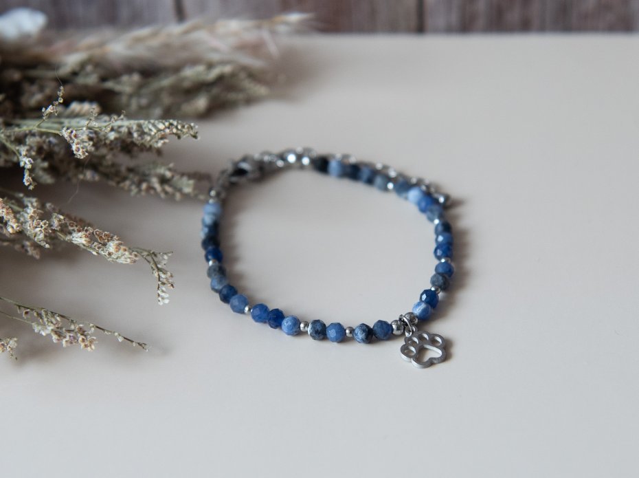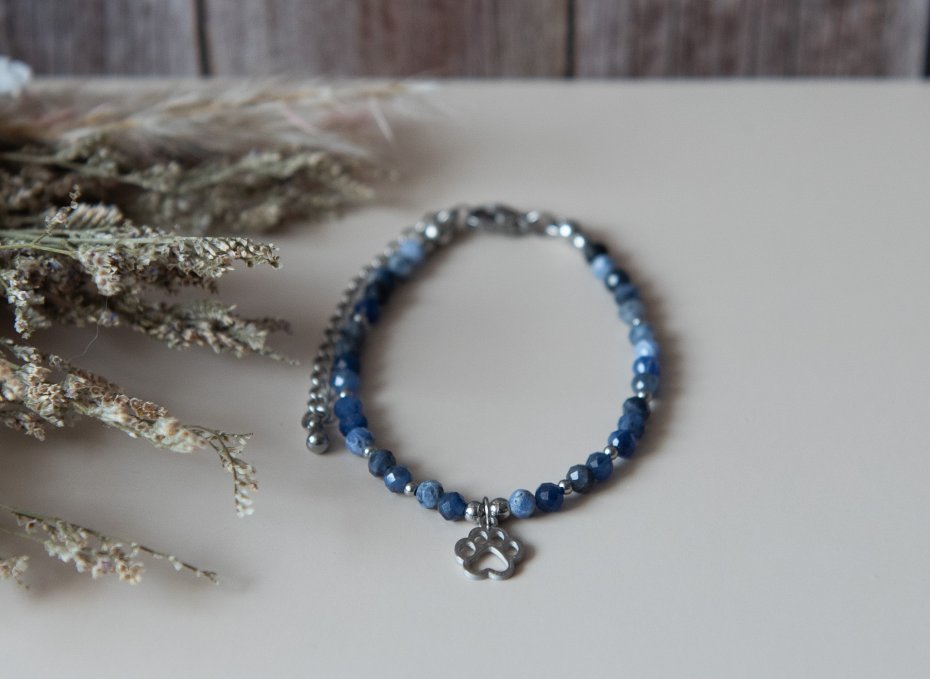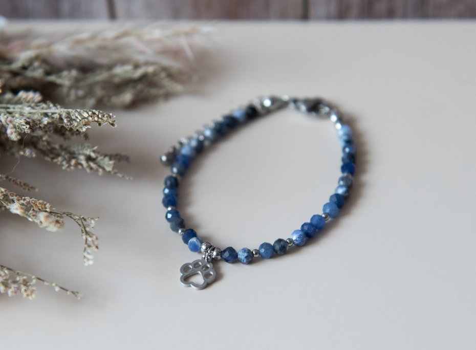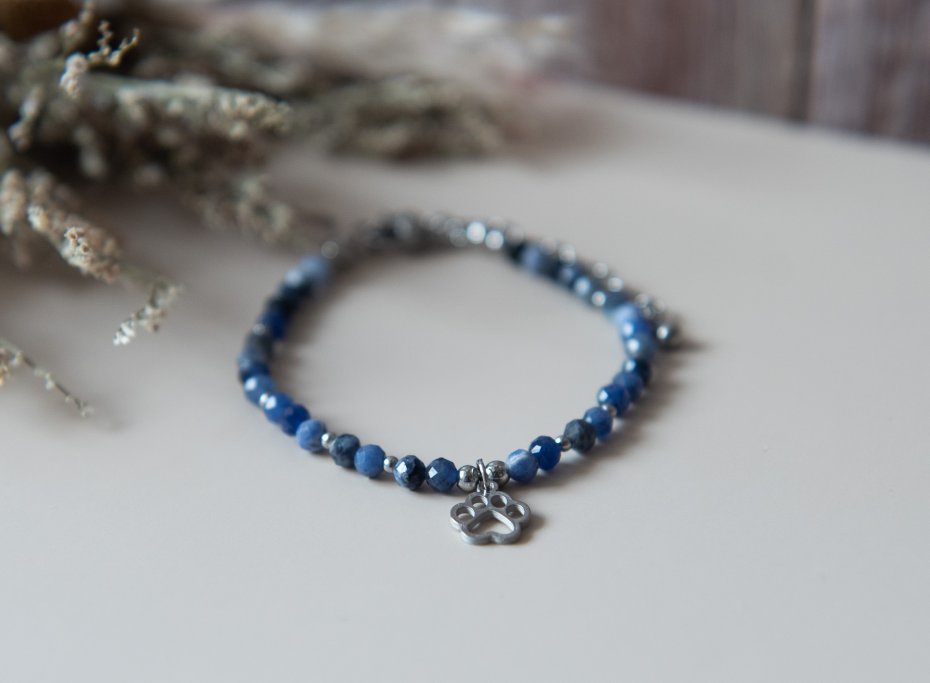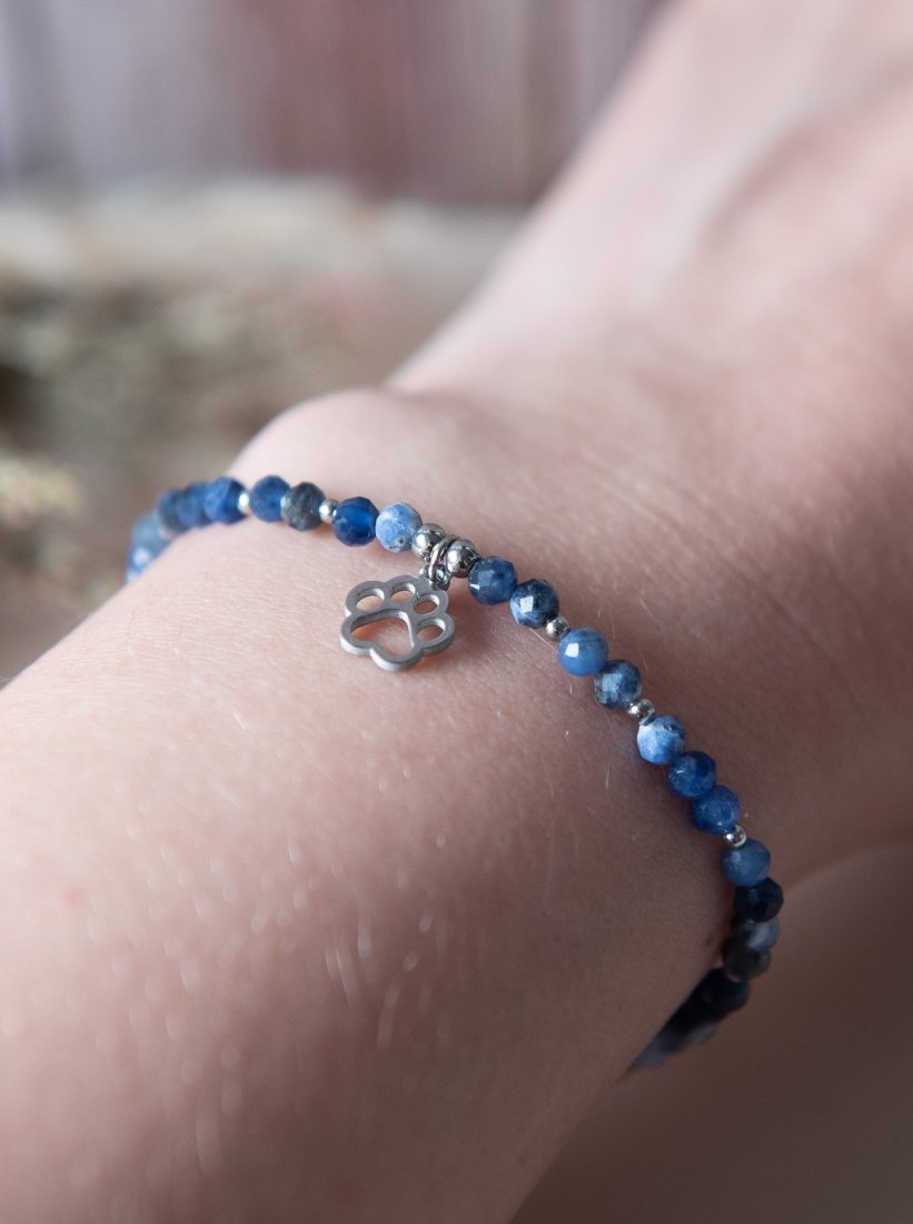 Bransoletka idealna dla każdej miłośniczki zwierząt, wykonana z kamieni - sodalit fasetowany (4 mm) oraz z elementów ze stali nierdzewnej. Biżuteria autorska, unikatowa, ręcznie wykonana.