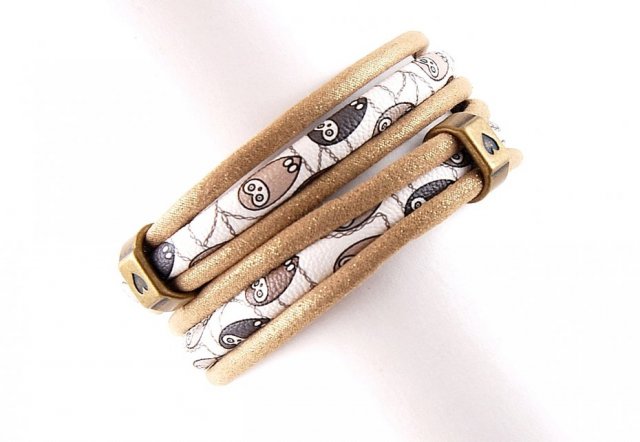 Bransoletka jest wykonana z efektownych rzemieni jubilerskich z nadrukiem we wzorek z motywem małych sówek, oraz rzemienia z impregnowanej tkaniny w kolorze złoto- beżowych z połyskiem.