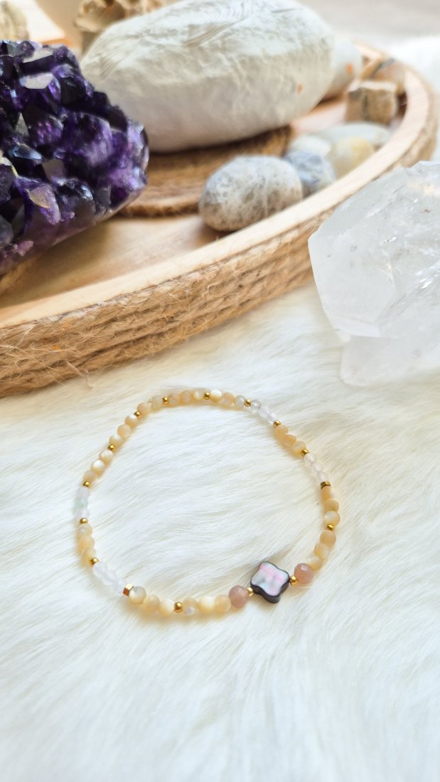 Bransoletka z muszli w połączeniu z kamieniem słonecznym i kwarcem różowym.