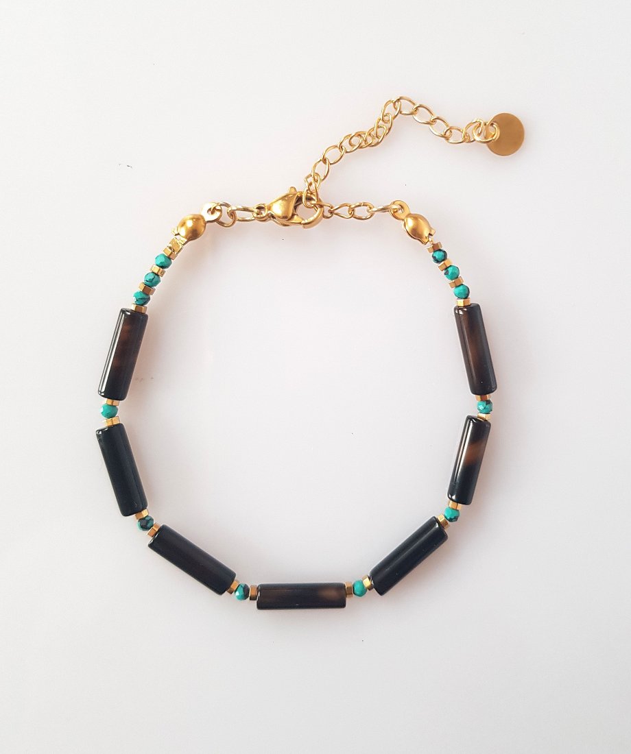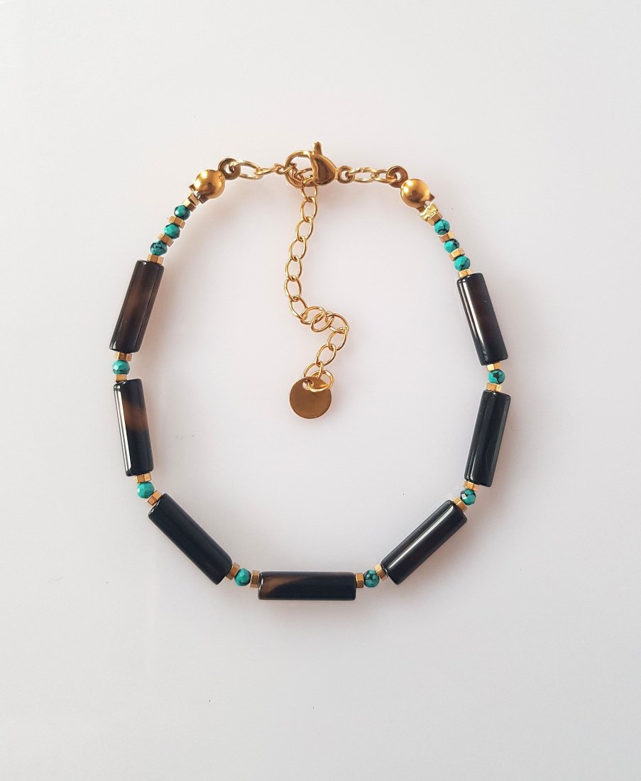 Patyczki onyksu pasiastego i drobne fasetowane kuleczki turkusowego magnezytu.
