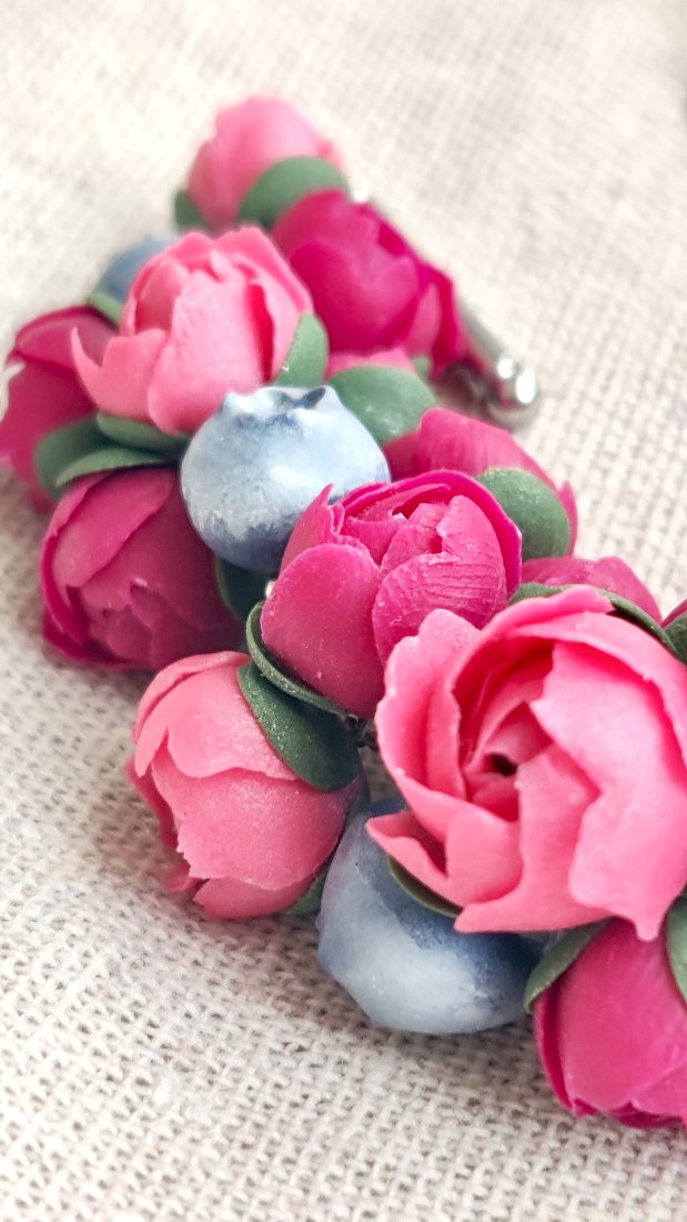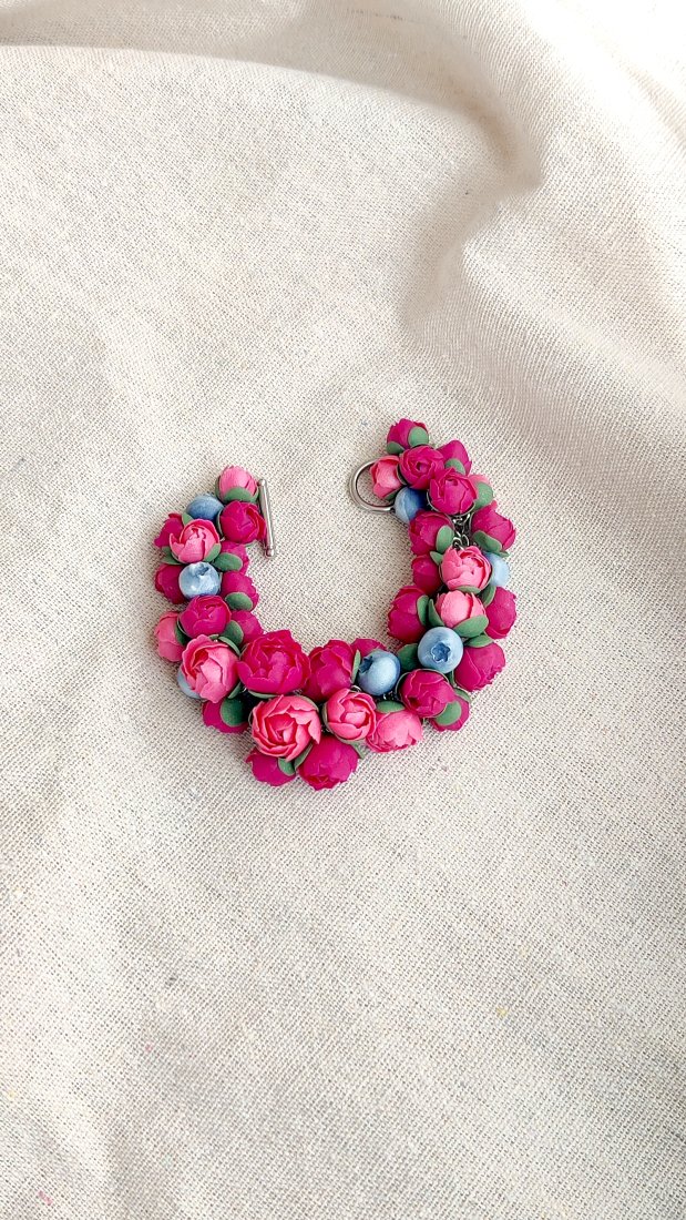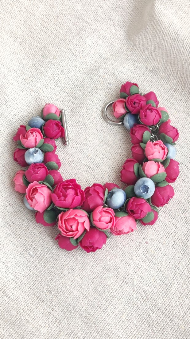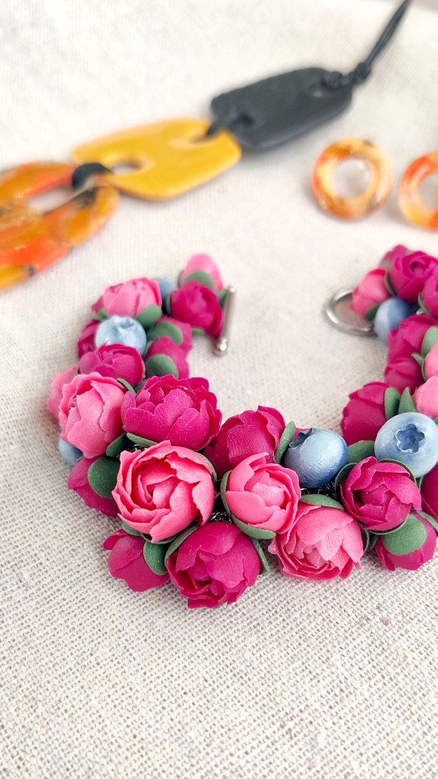 Odkryj magię wiosny z wyjątkową bransoletką ozdobioną realistycznymi piwoniami. Każdy płatek został z miłością ulepiony ręcznie z wysokiej jakości glinki polimerowej. To biżuteria, która nigdy nie więdnie i zawsze zachowuje swój świeży wygląd.