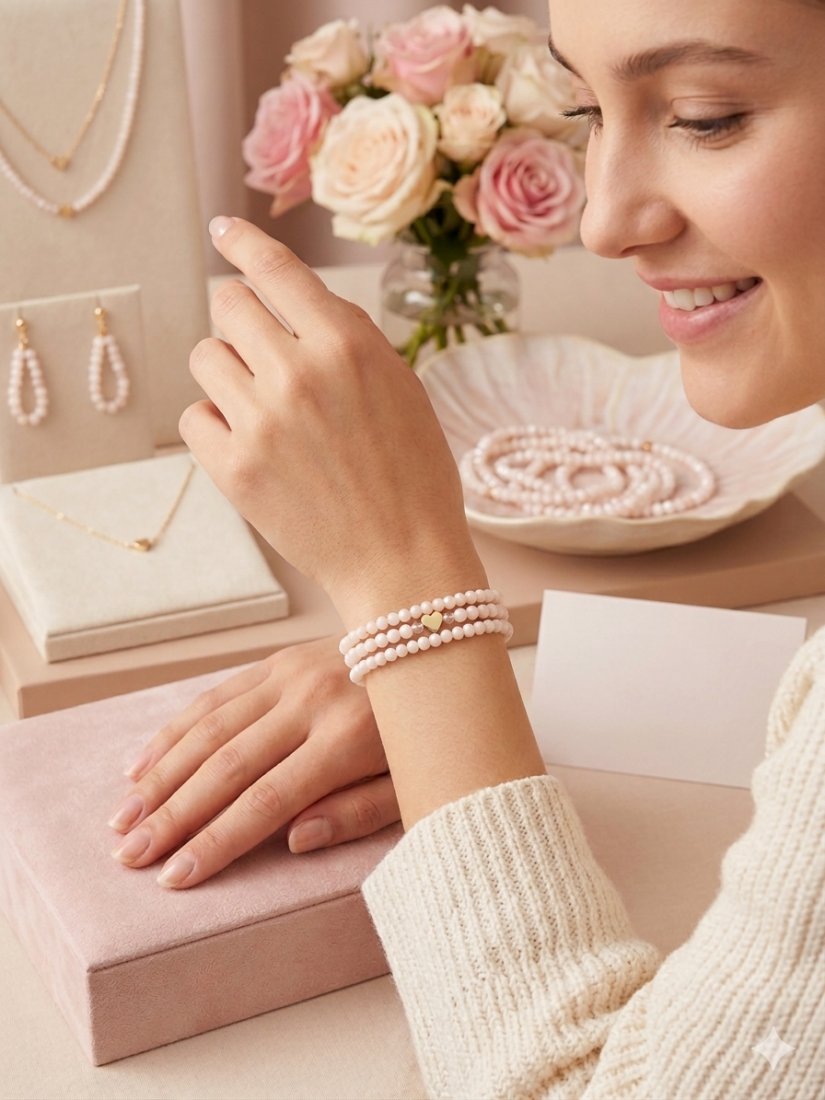 Dodaj swojemu nadgarstkowi delikatnego blasku dzięki potrójnej bransoletce. Wykonana z drobnych, fasetowanych koralików w odcieniu pudrowego różu, zwieńczona minimalistycznym złotym sercem z hematytu. To idealny dodatek dla kobiet ceniących subtelną elegancję i styl romantic chic. Doskonale prezentuje się solo, jak i w zestawieniu z ulubionym zegarkiem. Na małą dłoń 18 cm