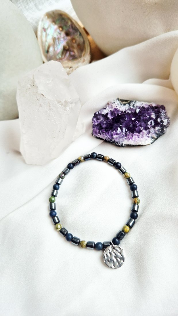 Bransoletka z hematytu i zielonego ryolitu.