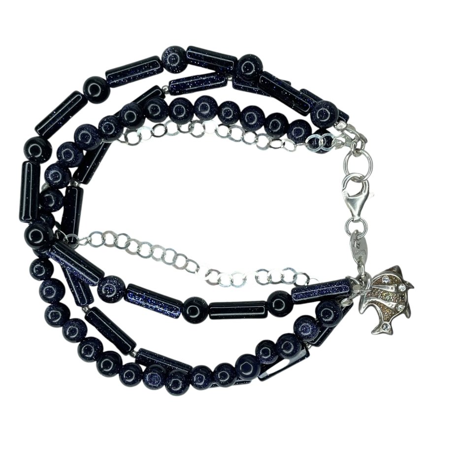 Potrójna bransoletka z nocą Kairu to elegancka propozycja dla kobiet, które cenią wyrafinowany styl i biżuterię o unikalnym charakterze. Ręcznie wykonana z kul i patyczków nocy Kairu, zachwyca głębokim odcieniem z drobnymi, połyskującymi refleksami, które nadają jej wyjątkowego blasku. Trzy starannie ułożone sznury kamieni tworzą harmonijną i pełną detali kompozycję, uzupełnioną jasnym srebrem próby 925 oraz zawieszką w kształcie rybki, dodającą całości lekkości i oryginalnego akcentu. Komfortowa w noszeniu i perfekcyjnie wykończona, doskonale sprawdzi się jako elegancki dodatek zarówno do codziennych stylizacji, jak i na wyjątkowe okazje.