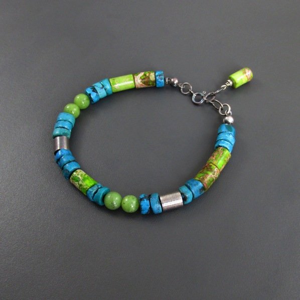 Bransoletka idealnie pasująca na co dzień do dżinsów. Wykonana z walców turkusu, jaspisu cesarskiego oraz kul nefrytu o średnicy 6 mm. Całość oprawiona w srebro 925, oksydowane i wypolerowane. Długość bransoletki wynosi 18,5 cm, plus łańcuszek regulacyjny 2 cm. Będzie pasowała na nadgarstek 15,5-17 cm. Elegancko zapakowana.