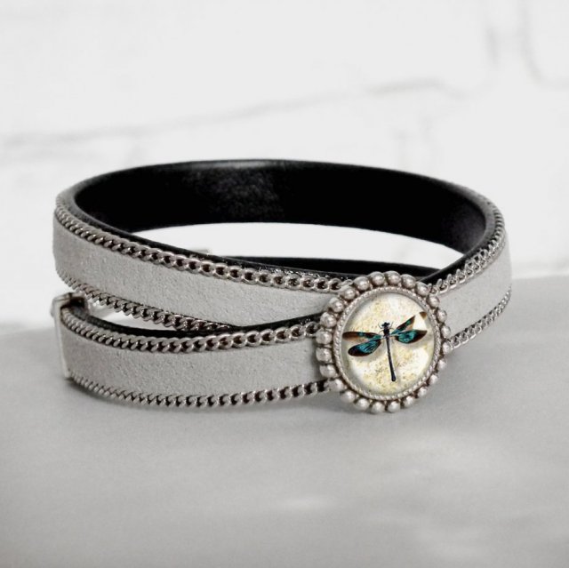 Modna bransoletka, ręcznie wykonana, z unikatową grafiką artystyczną umieszczoną pod wypukłym szkłem tzw. kaboszonem, dającym efekt głębi w oprawie w kolorze antycznego srebra. Grafika jest najwyższej jakości, bardzo wyraźna i nasycona, wywołana na wysokiej klasy papierze fotograficznym. Oczko z grafiką przymocowane do zamszowego ekologicznego rzemienia z lamówką w postaci delikatnego łańcuszka. Wewnętrzna część rzemienia wykonana z eleganckiej, czarnej eko-skórki. Elementy metalowe hipoalergiczne. Bransoletka dwukrotnie owijana wokół nadgarstka. Całość wyrafinowana, a jednocześnie prosta w formie.