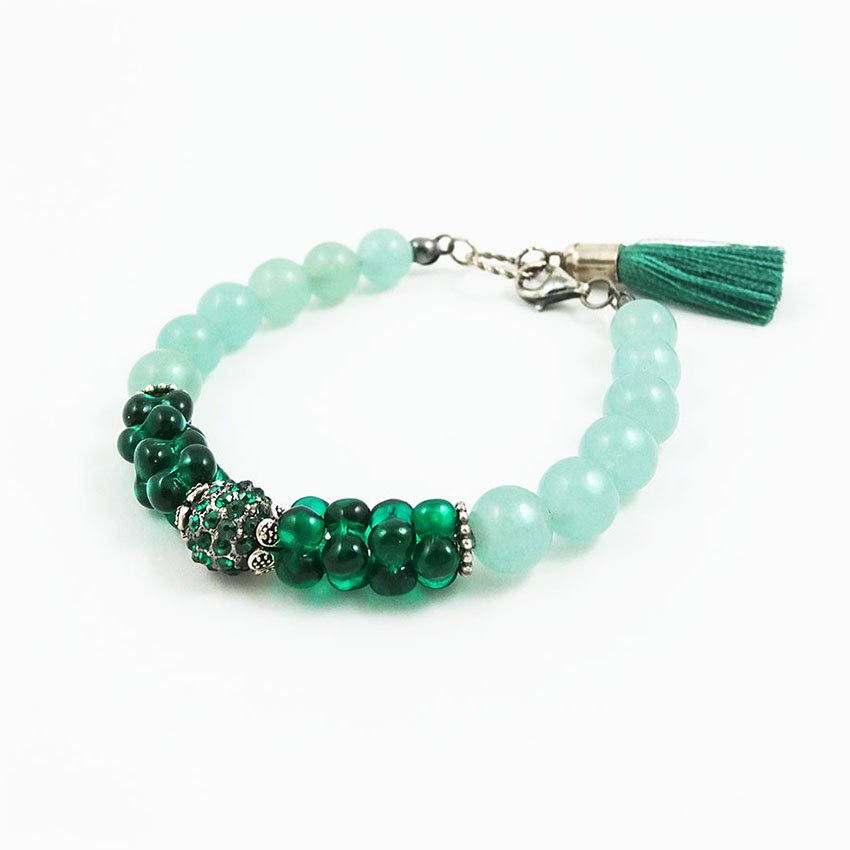 Srebrna bransoletka z kulek jadeitu, o mlecznozielonej barwie (8mm), bardzo oryginalnych czeskich szklanych koralików i kulki z zielonymi cyrkoniami.