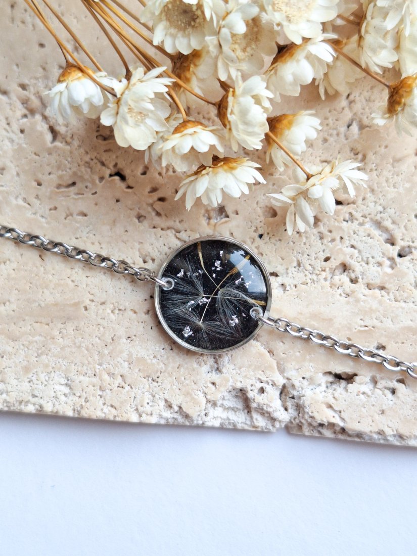 Urocza bransoletka w kształcie kółka z zatopionymi nasionami dmuchawca i płatkami srebra na czarnym połyskującym tle. Wykonana z wysokiej klasy żywicy, która nie zmienia koloru pod wpływem promieniowania uv oraz wysokiej jakości stali chirurgicznej.