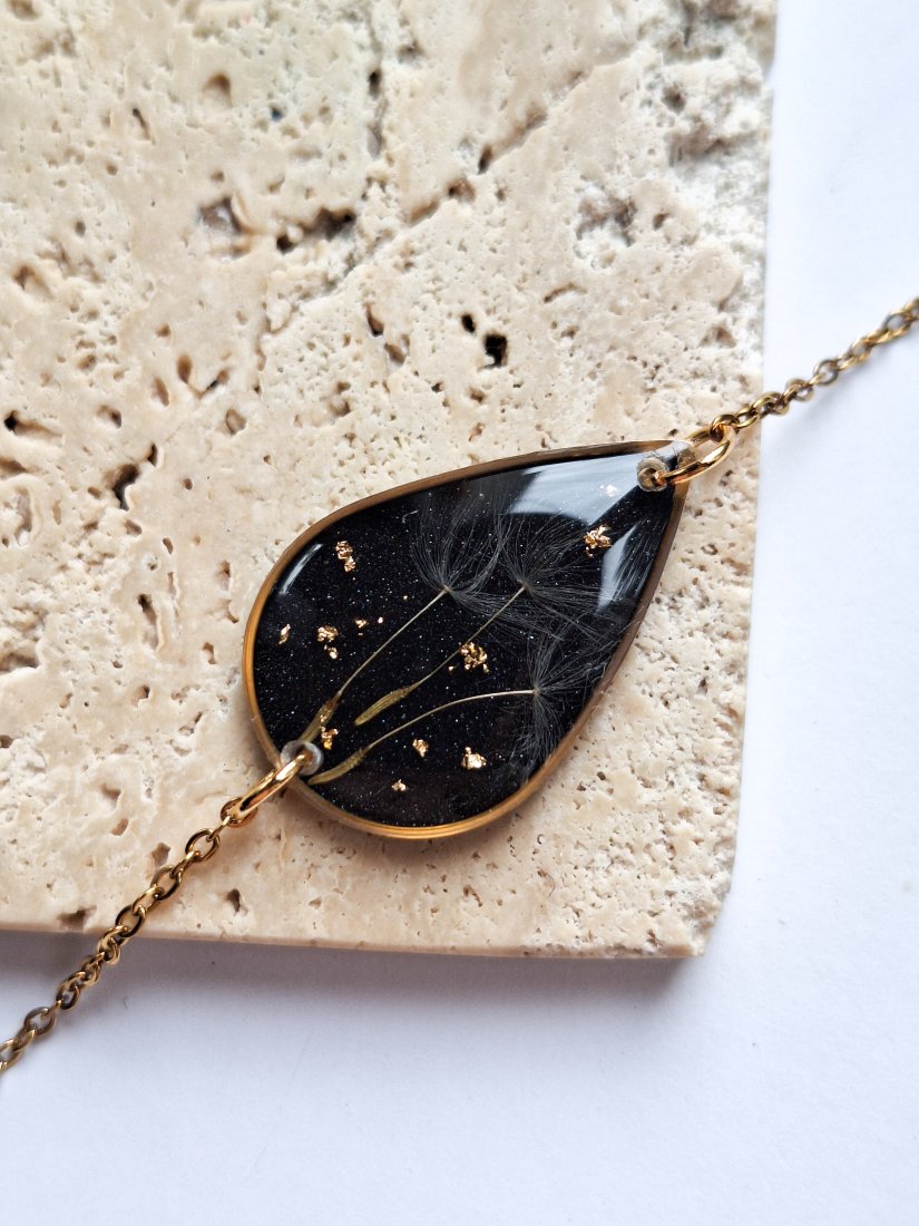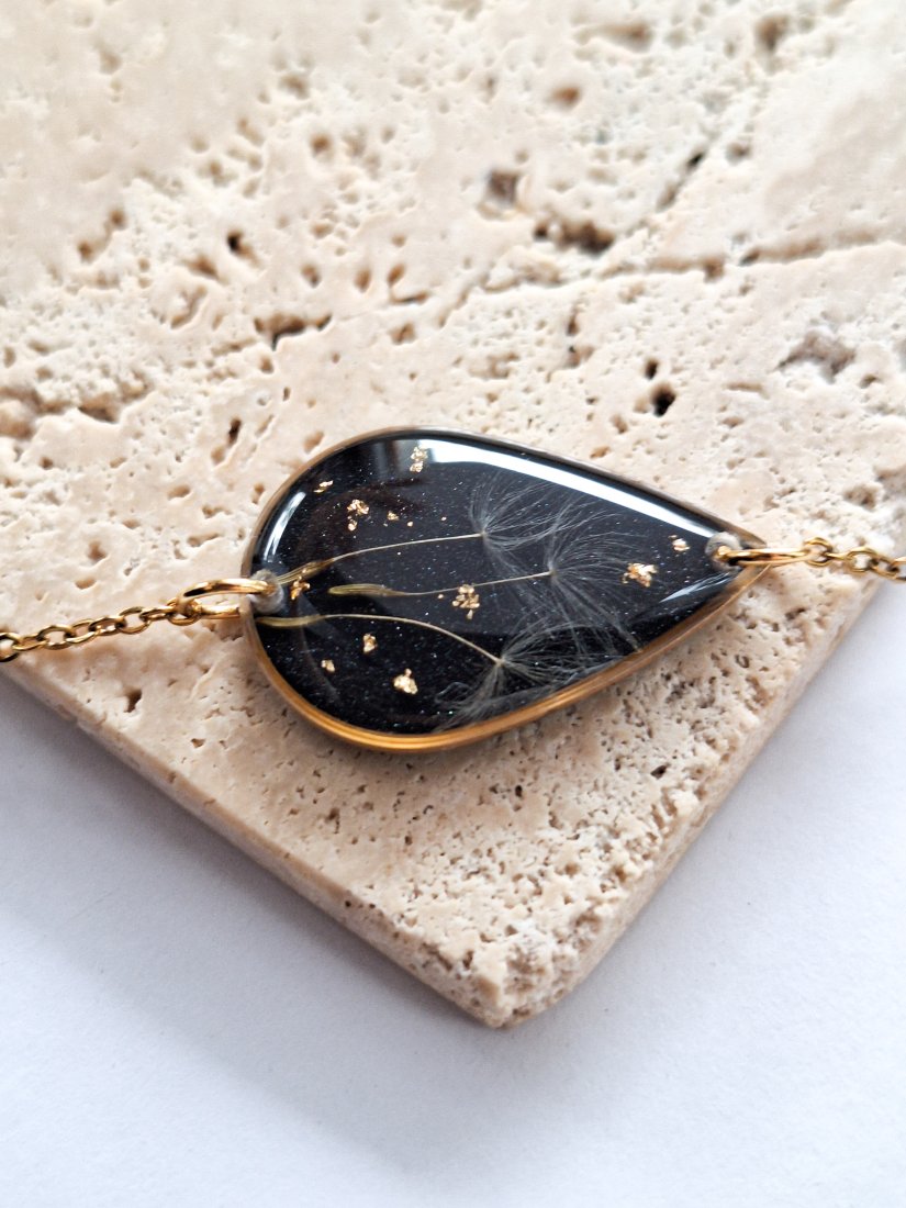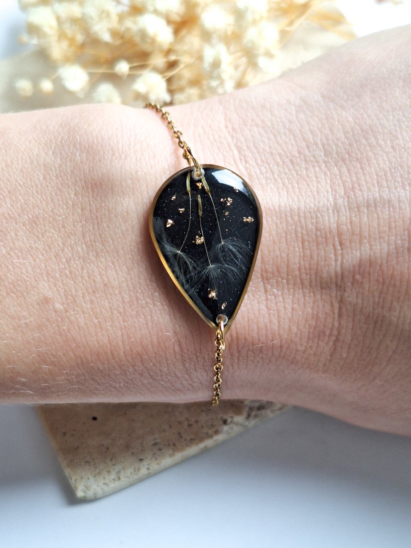 Urocza bransoletka w kształcie łezki z zatopionymi nasionami dmuchawca i płatkami złota na czarnym połyskującym tle. Wykonana z wysokiej klasy żywicy, która nie zmienia koloru pod wpływem promieniowania uv oraz wysokiej jakości stali chirurgicznej.