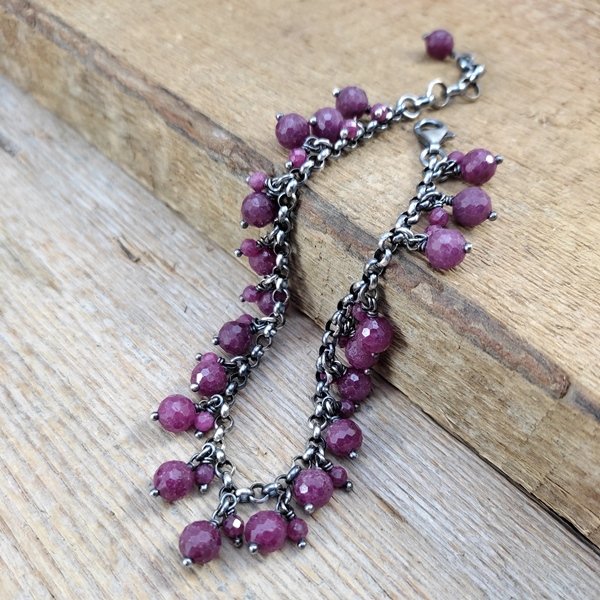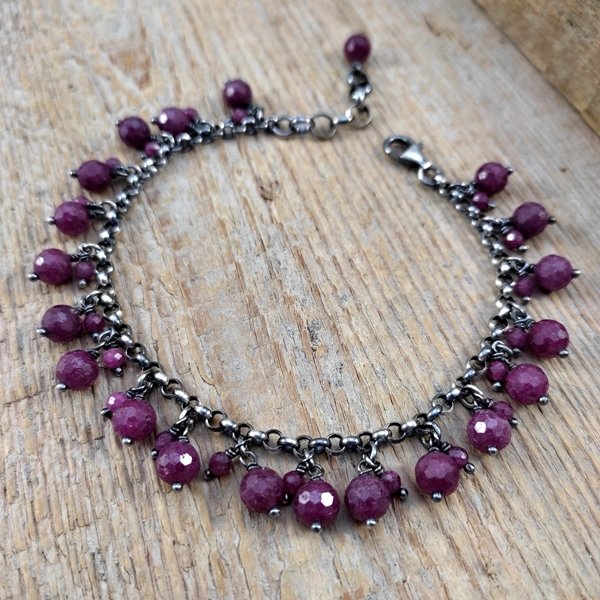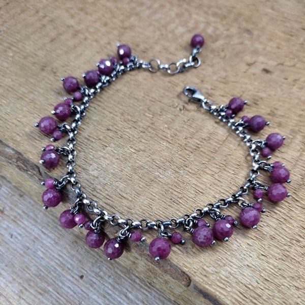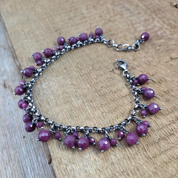 Bransoletka wykonana z fasetowanych kul rubinu ok. 3-6 mm. Całość dopełniona srebrem 925, oksydowanym i wypolerowanym.