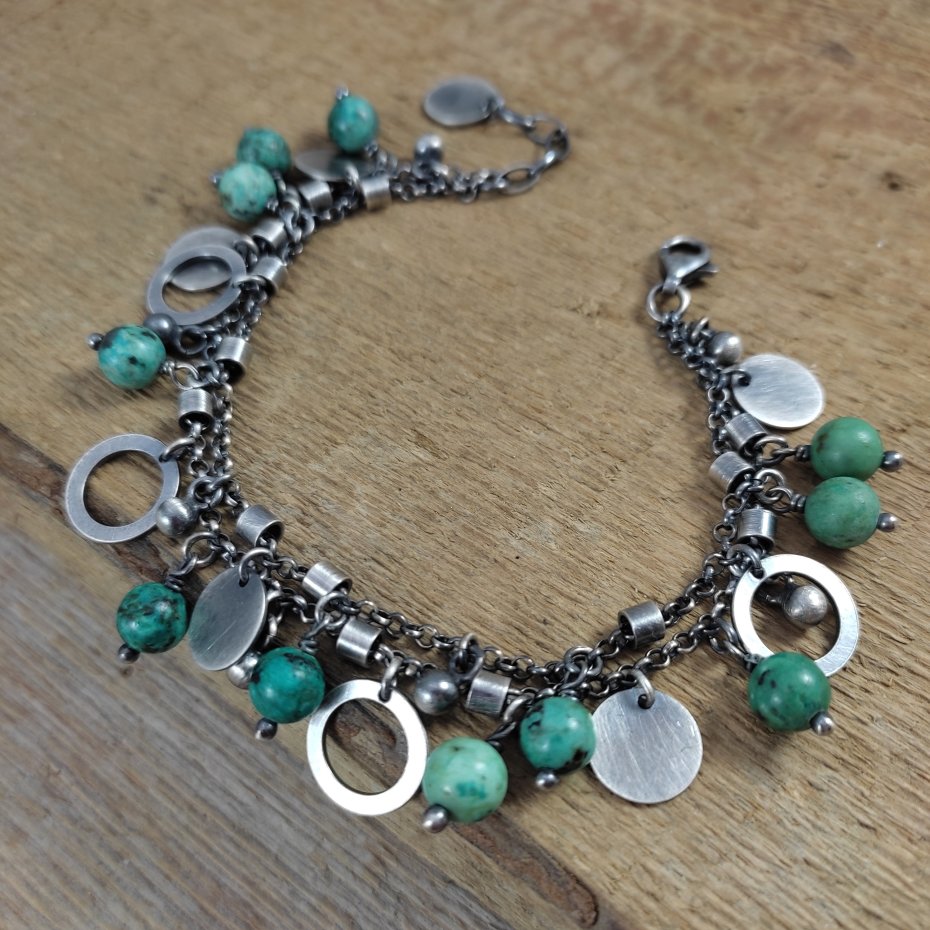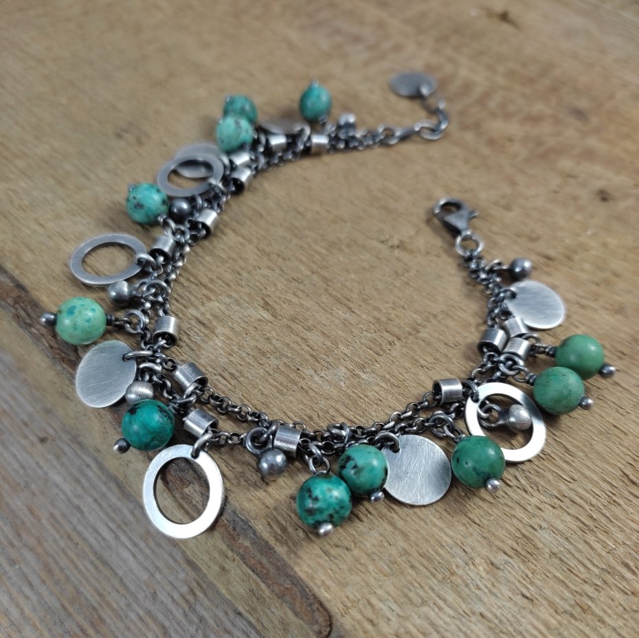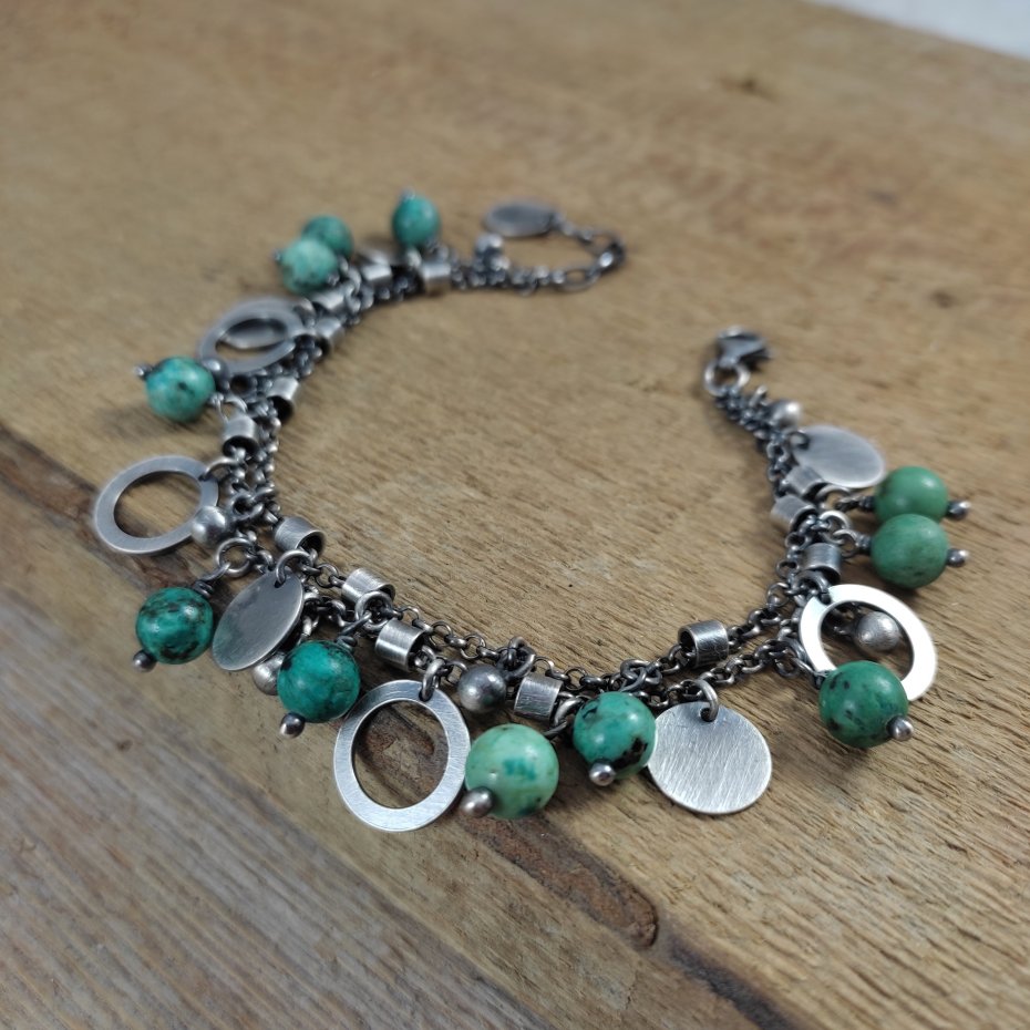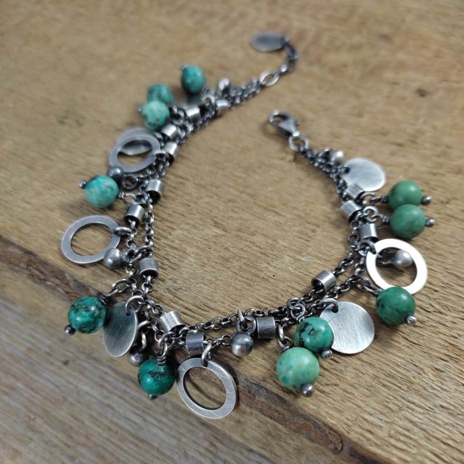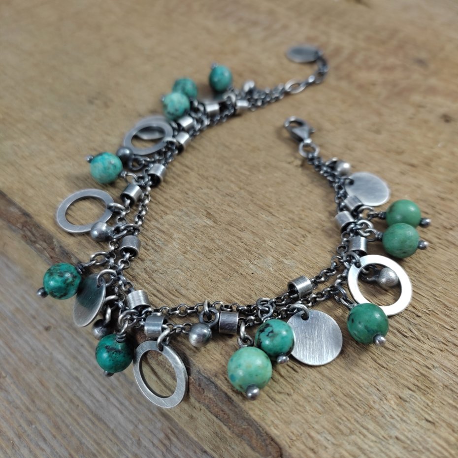Bransoletka wykonana z kul turkusu ok. 6 mm. Całość dopełniona srebrem 925, oksydowanym i wypolerowanym.