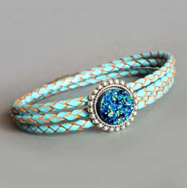 Subtelna bransoletka ze skóry naturalnej i elementu ozdobnego z oczkiem z żywicy akrylowej typu ''druzy'', która piękne błyszczy barwami od głębokiego błękitu po zieleń o odcieniach morskiej toni. Elementy metalowe hipoalergiczne. Bransoletka trzykrotnie owijana wokół nadgarstka. Zapięcie magnetyczne z zabezpieczeniem przed rozpięciem.